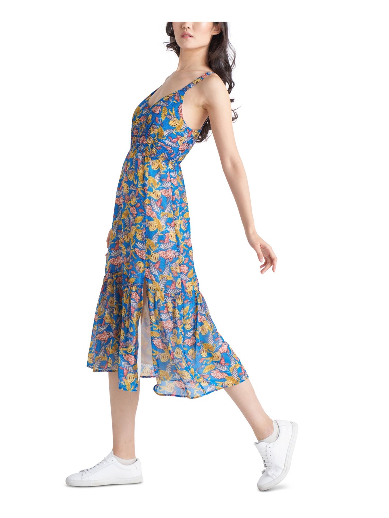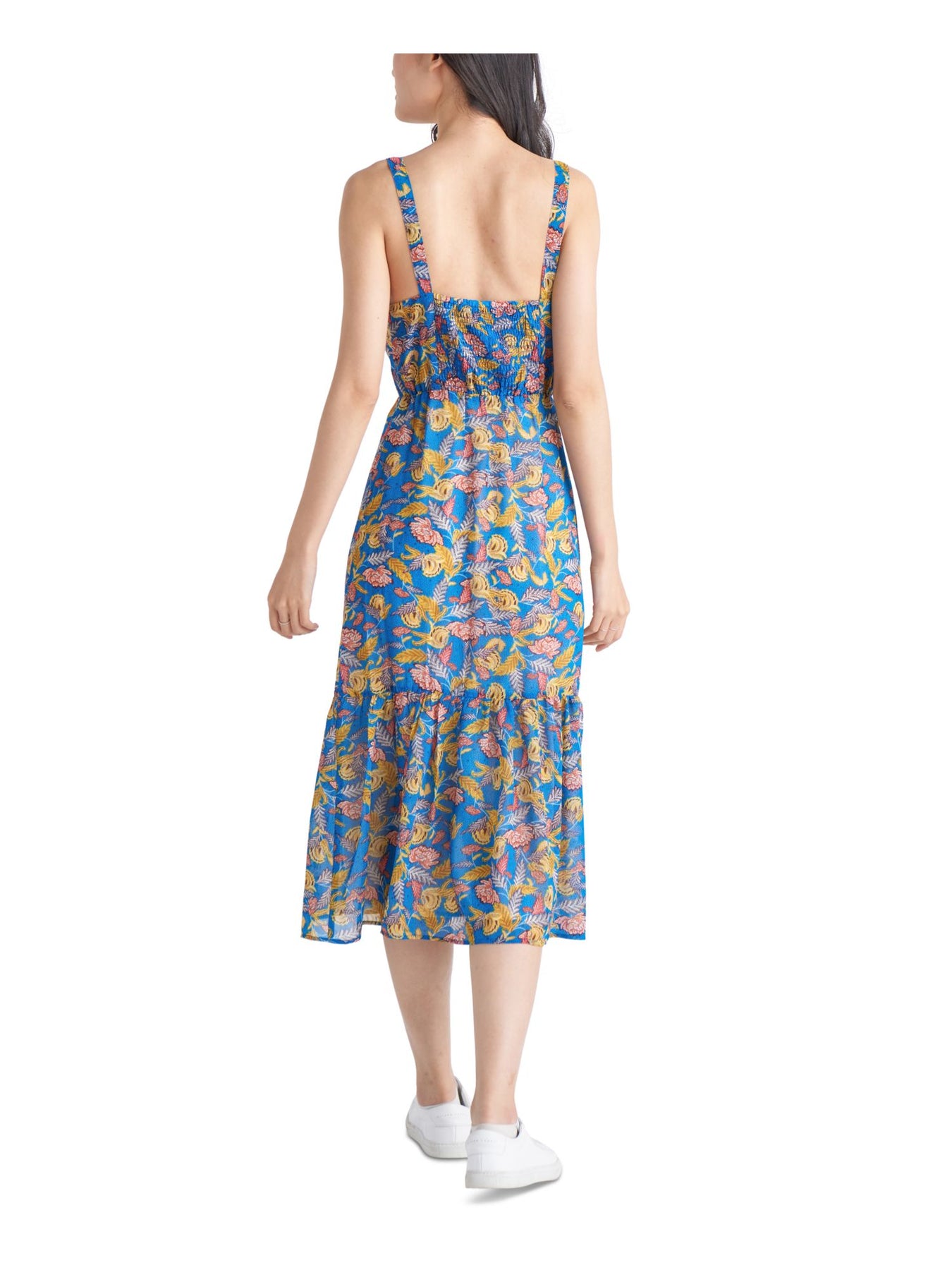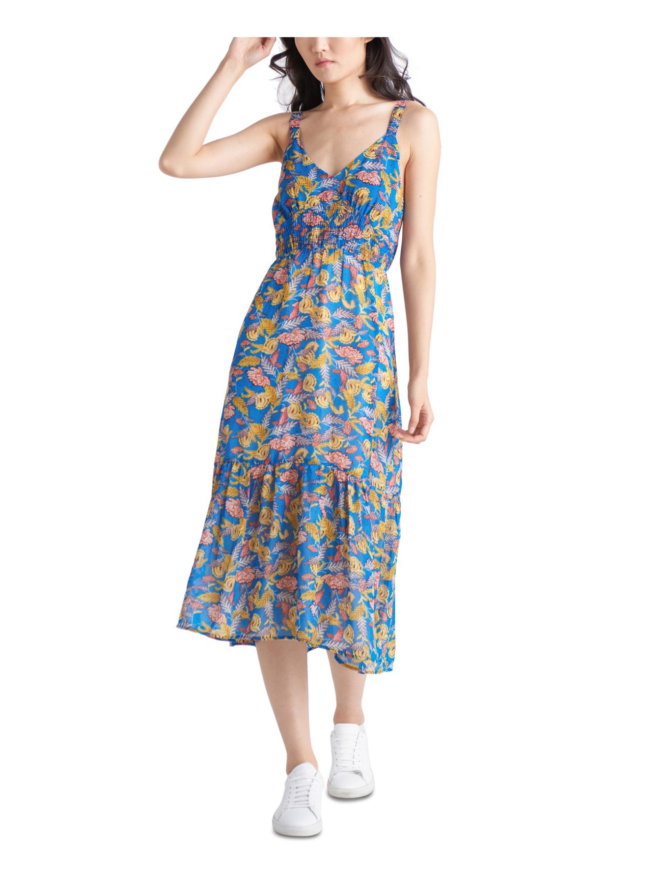 Womens Blue Smocked Slitted Tiered Skirt Lined Printed Sleeveless V Neck Midi Fit + Flare Dress