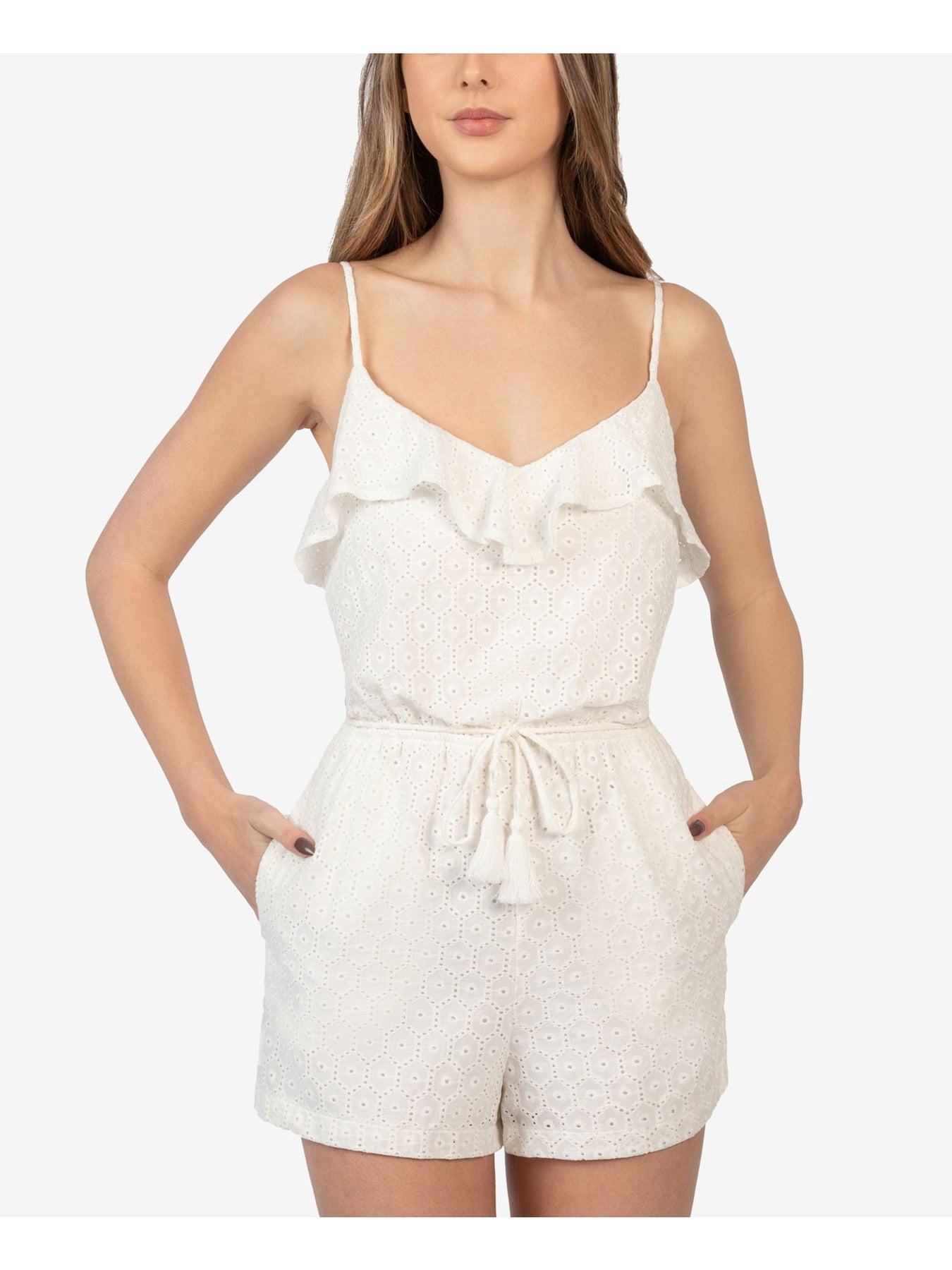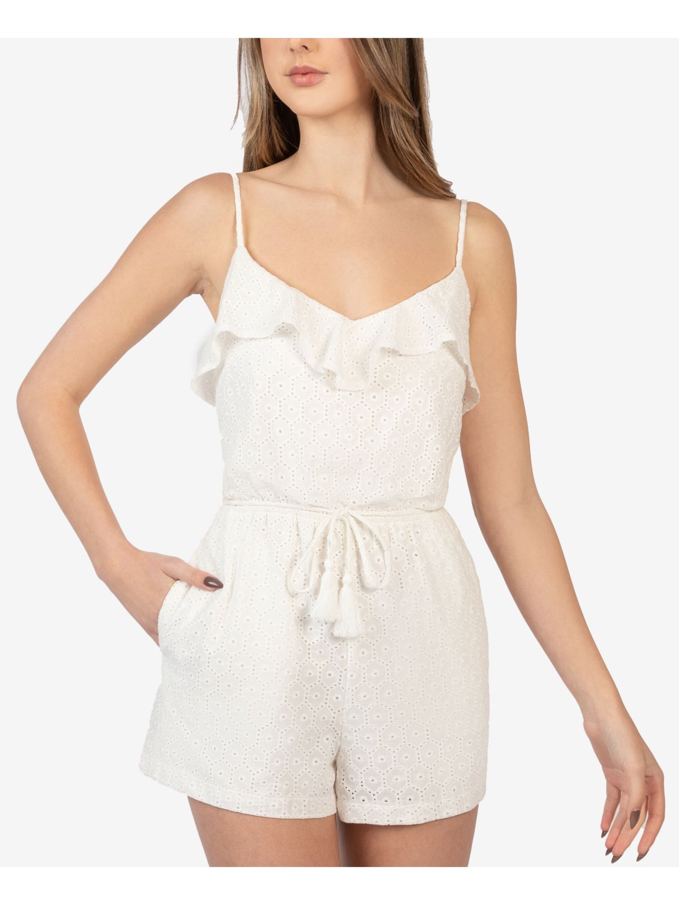 B DARLIN Womens Ivory Eyelet Tie Ruffle Adjustable Spaghetti Strap V Neck Wear To Work Straight leg Romper 9\10