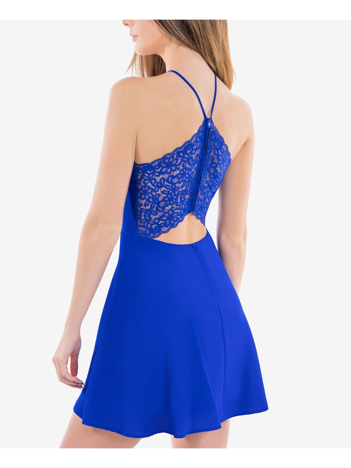 B DARLIN Womens Blue Stretch Zippered Textured Lace-back Sleeveless Halter Short Party A-Line Dress 7