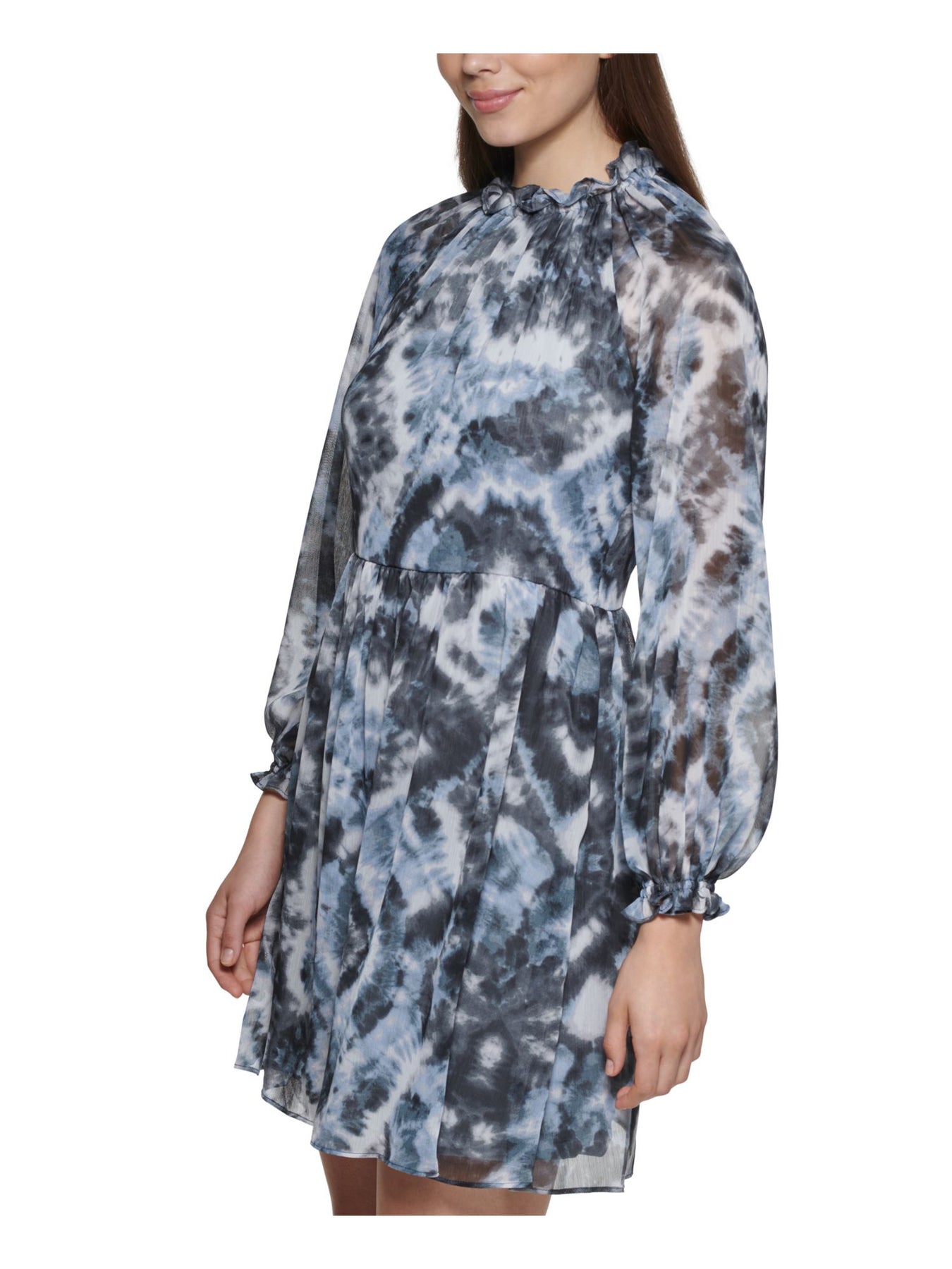 CALVIN KLEIN Womens Blue Zippered Ruffled Tie Keyhole Back Elastic Waist Long Sleeve Jewel Neck Short Fit + Flare Dress 2