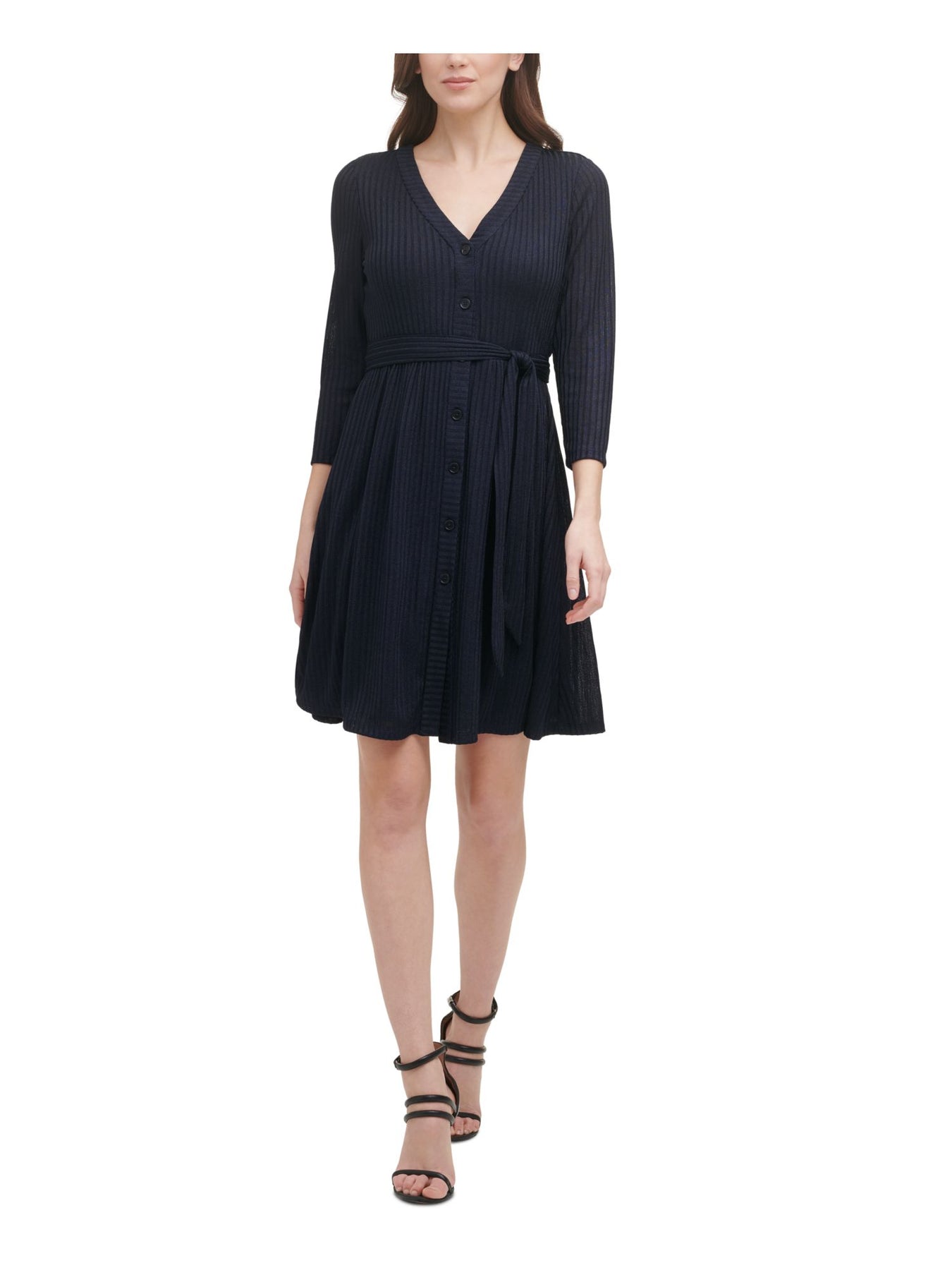 DKNY Womens Stretch Belted Lined Button Front 3/4 Sleeve V Neck Above The Knee Evening Fit + Flare Dress
