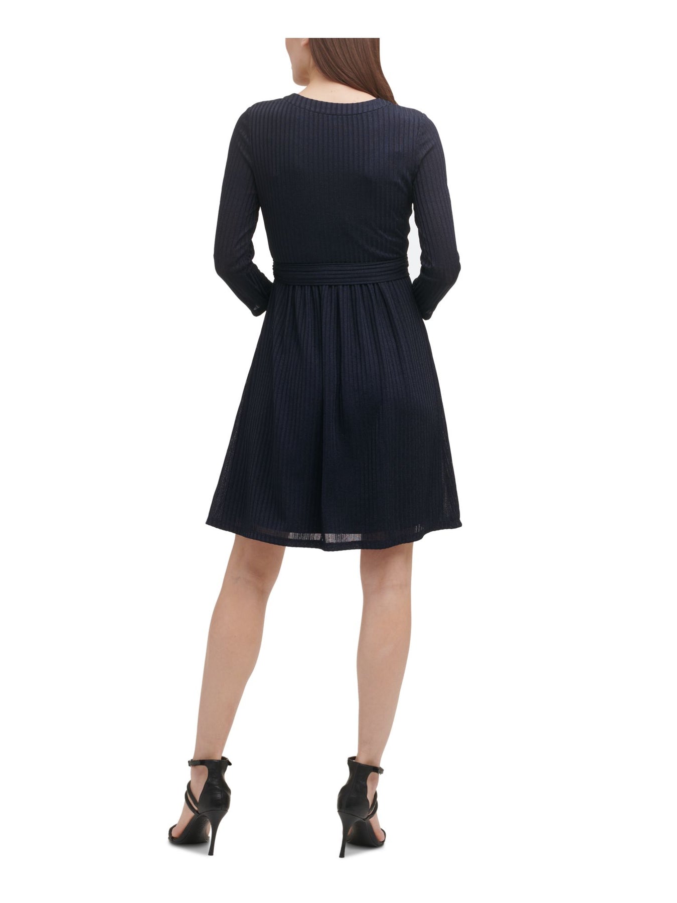 DKNY Womens Stretch Belted 3/4 Sleeve V Neck Above The Knee Evening Fit + Flare Dress