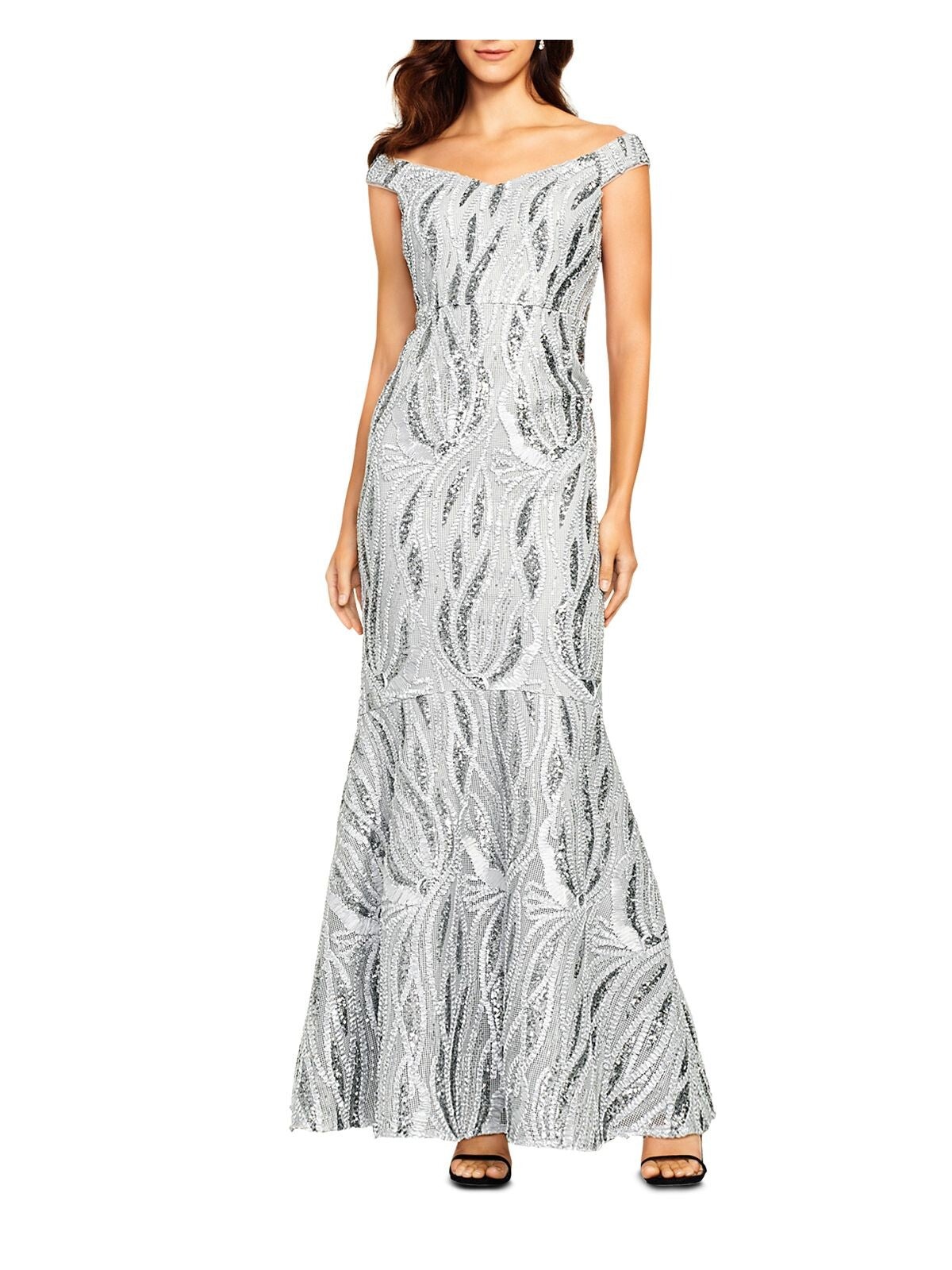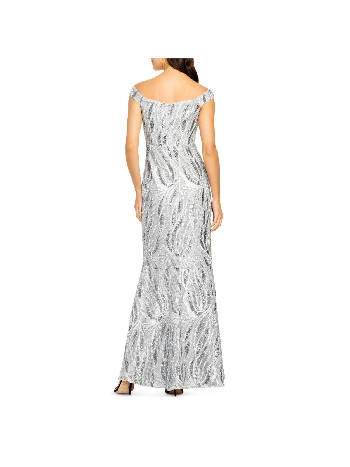 AIDAN MATTOX Womens Silver Sequined Embroidered Trumpet Gown Sleeveless Off Shoulder Maxi Formal Dress 2