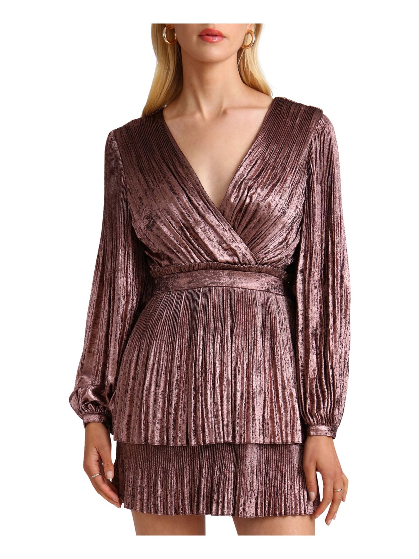 Womens Pink Pleated Zippered Pintuck Waist Tiered Skirt Lined Blouson Sleeve Surplice Neckline Mini Party Fit + Flare Dress