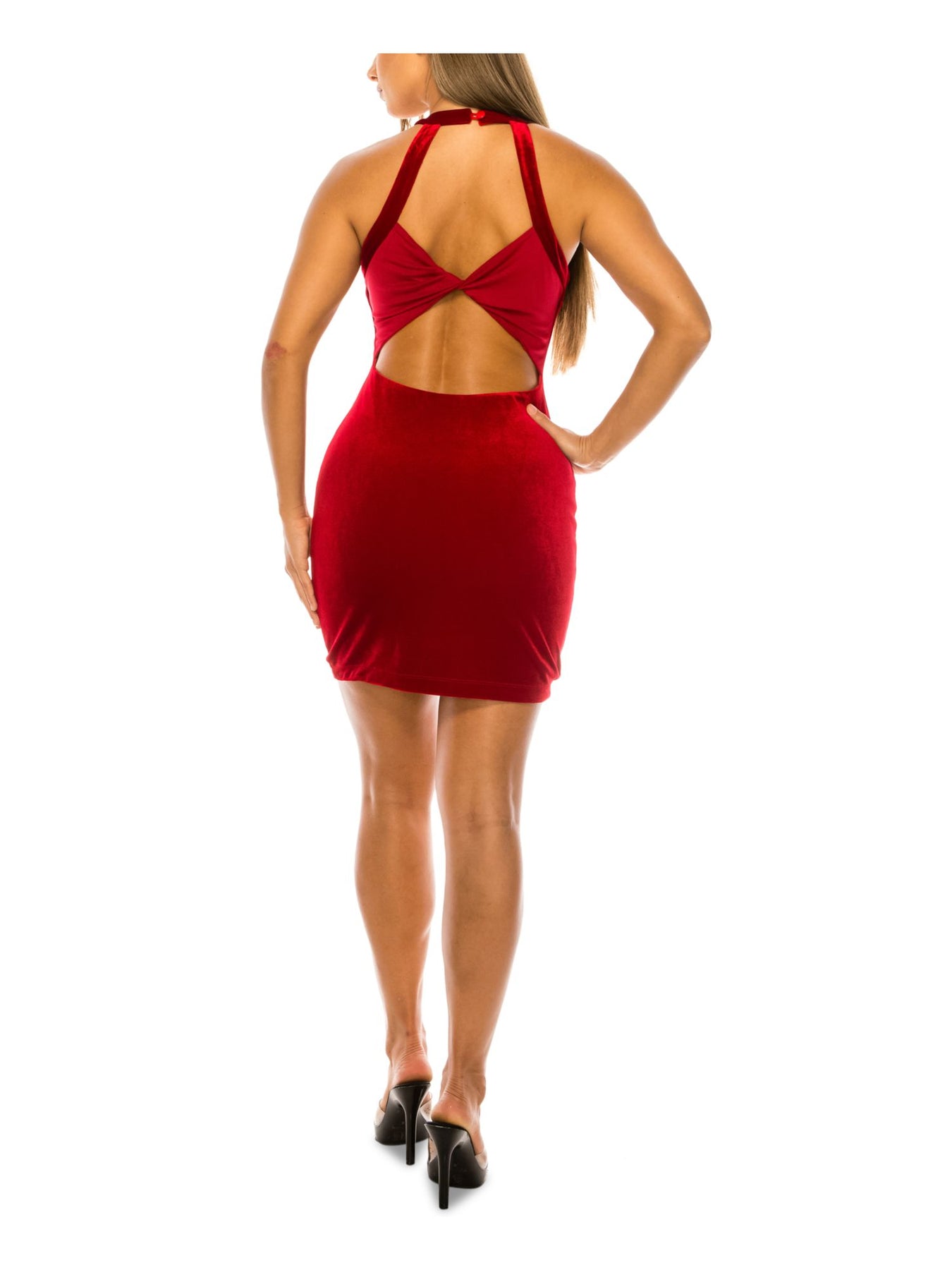 B DARLIN Womens Red Stretch Short Length Open Back With Twist Lined Sleeveless Halter Mini Evening Sheath Dress 15\16