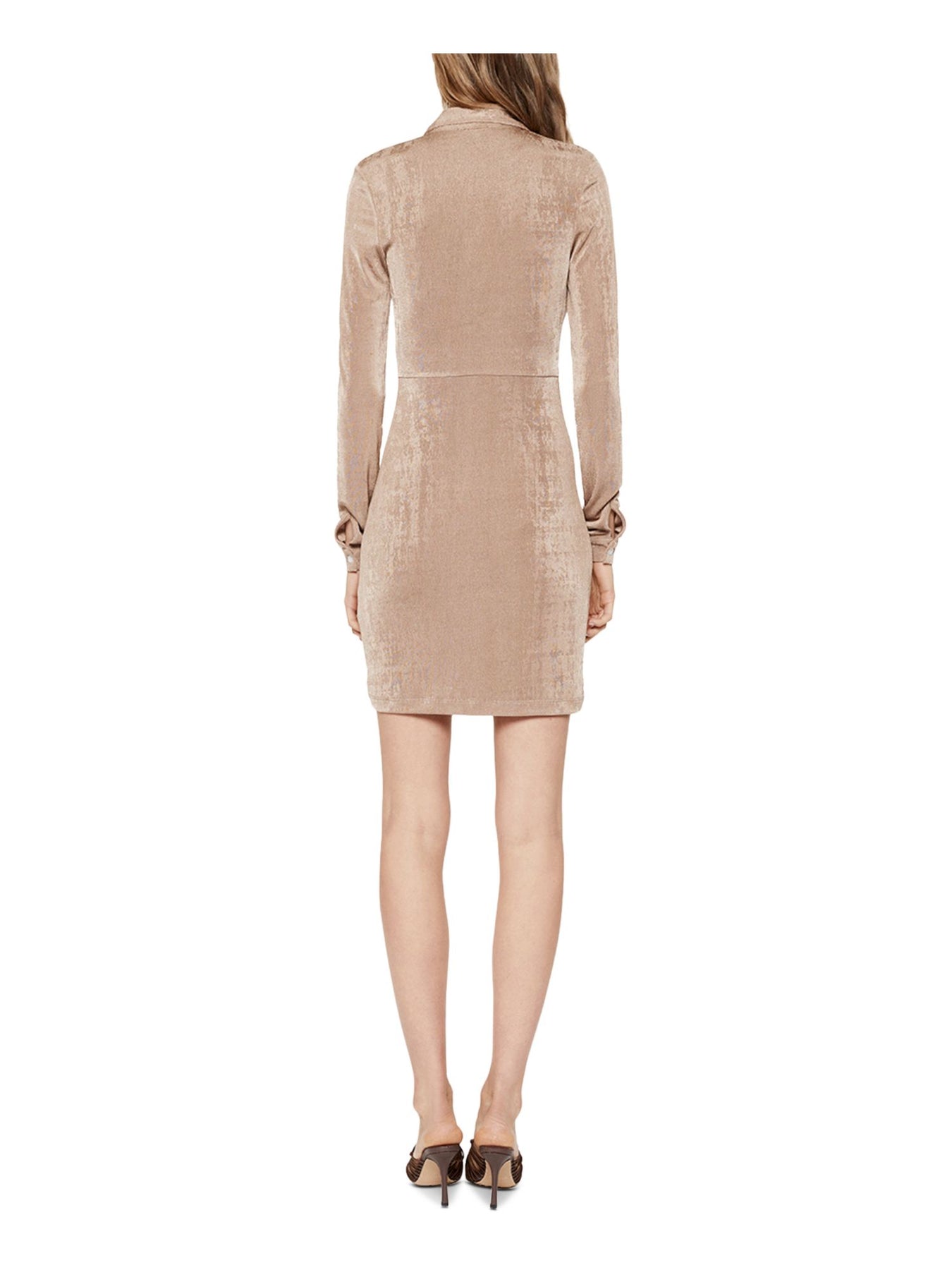 BARDOT Womens Beige Stretch Ruched Button Front Long Sleeve Collared Short Shirt Dress 6