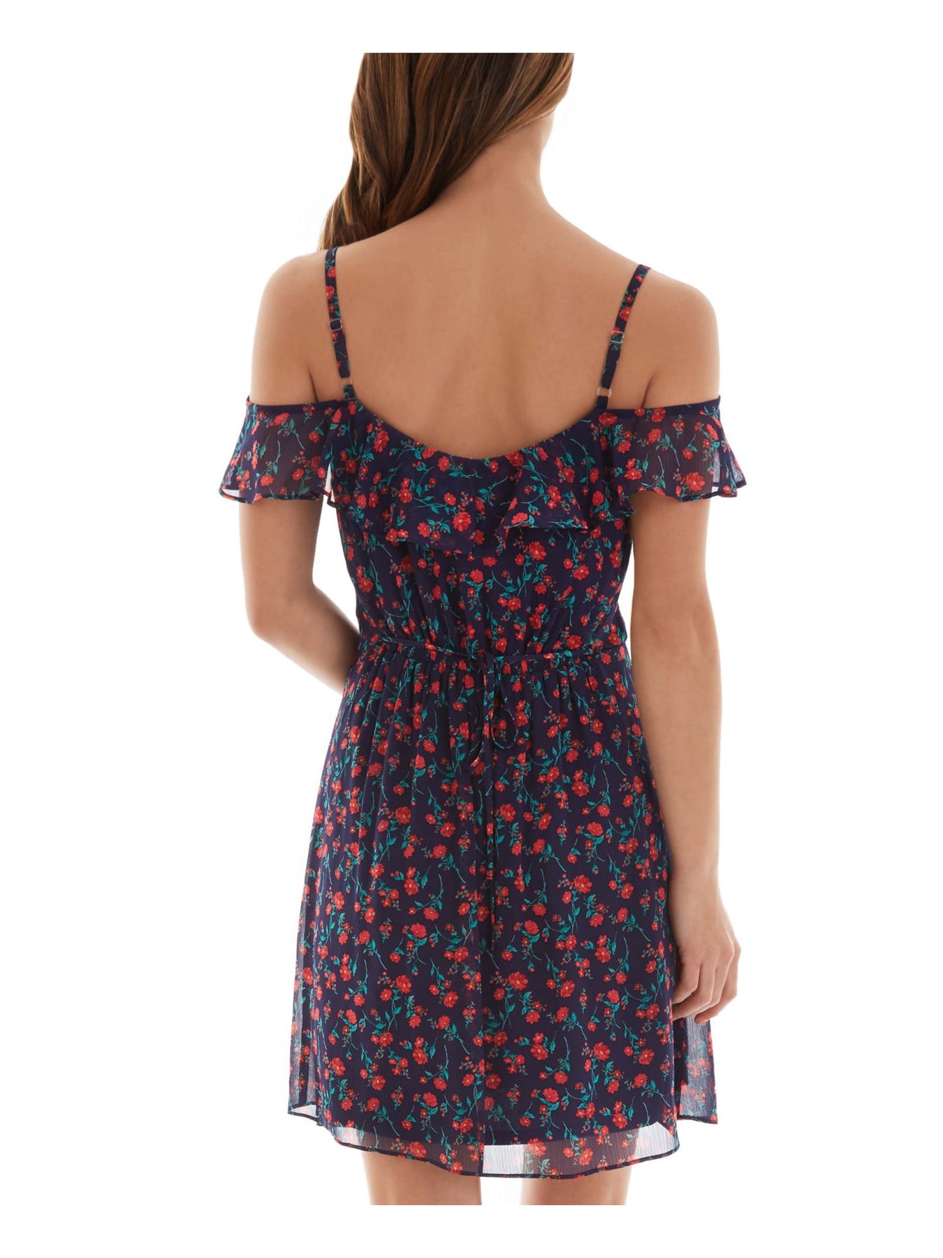 Womens Navy Cold Shoulder Ruffled Floral Flutter Sleeve Sweetheart Neckline Short Fit + Flare Dress