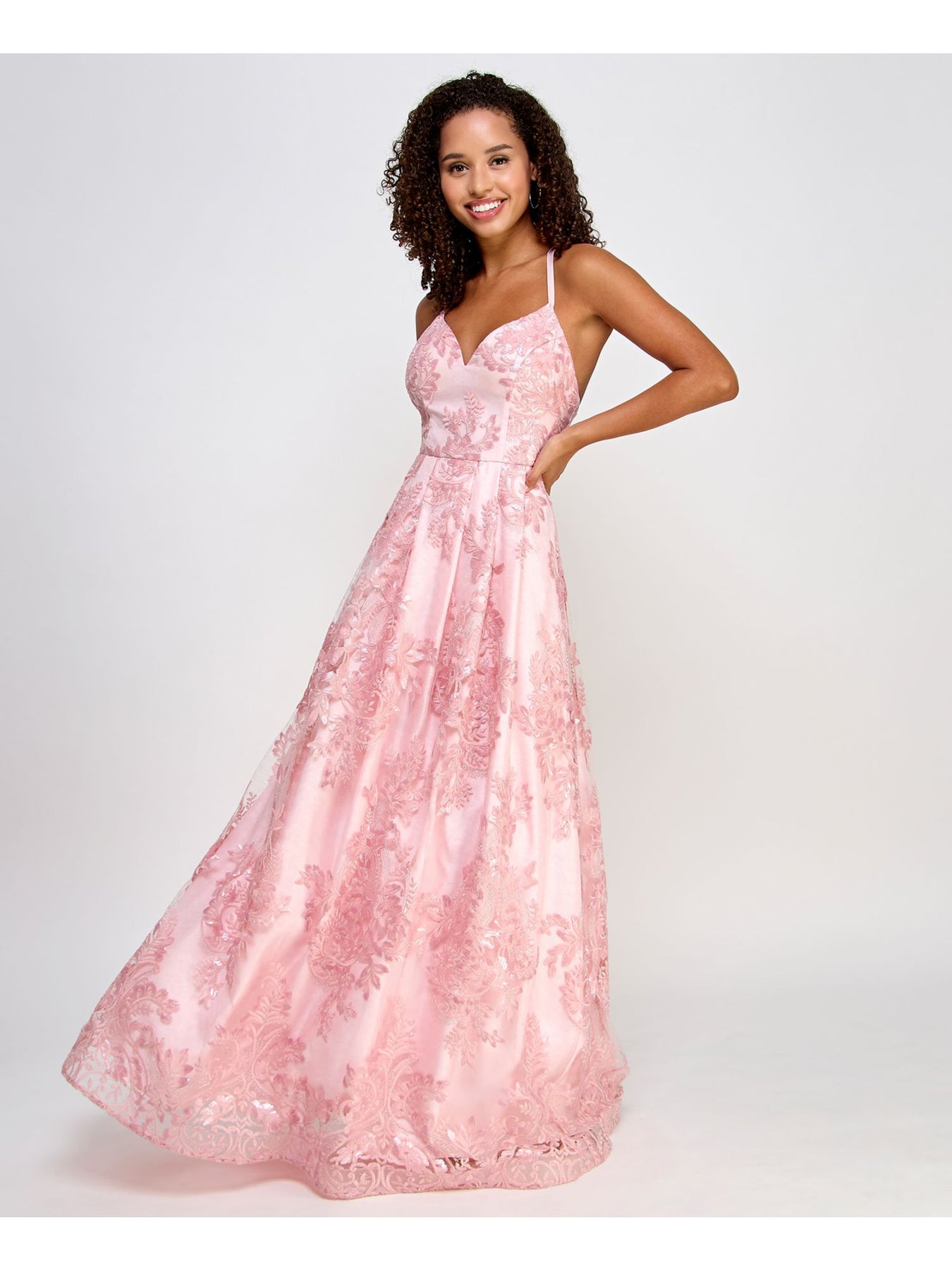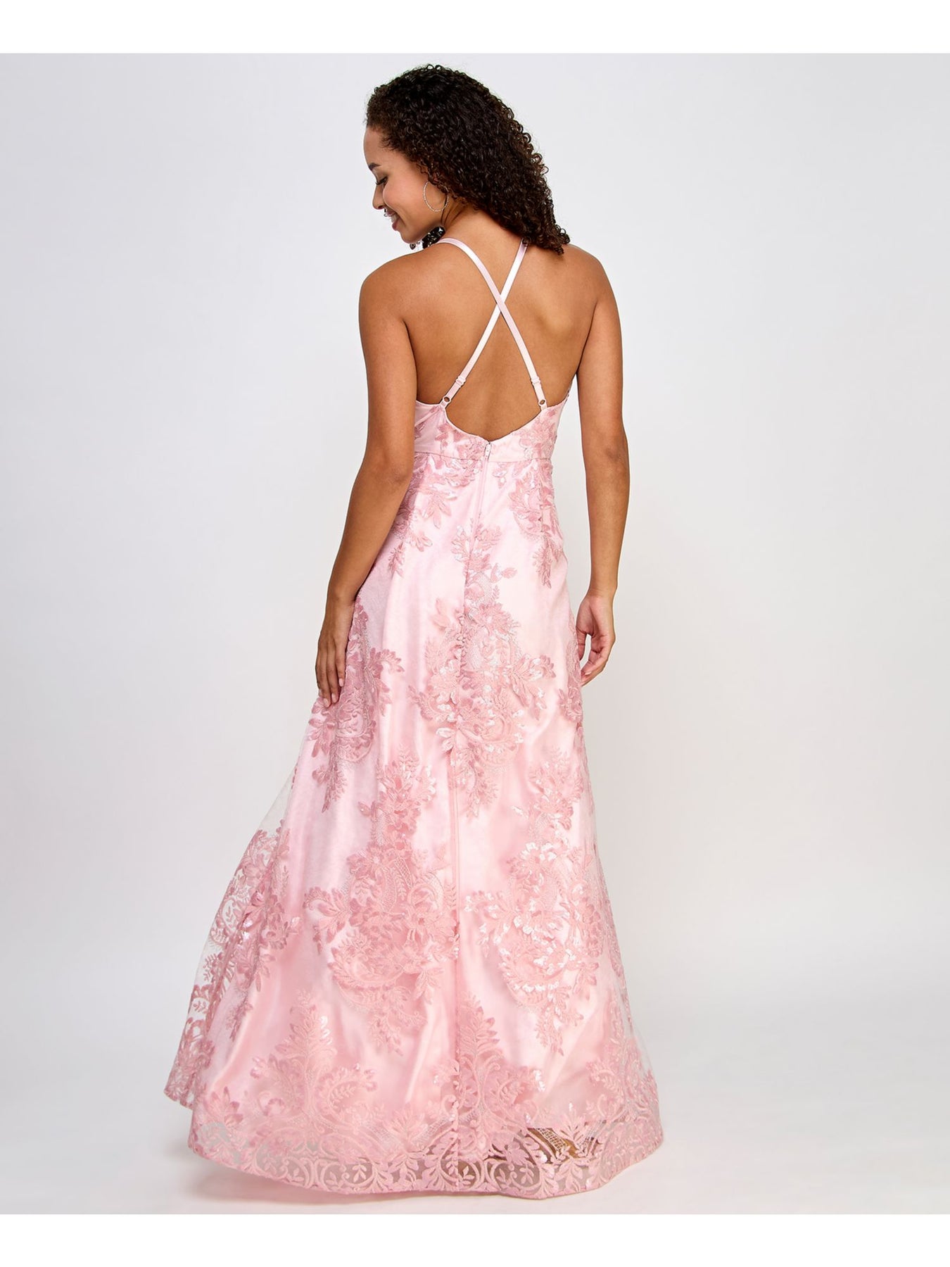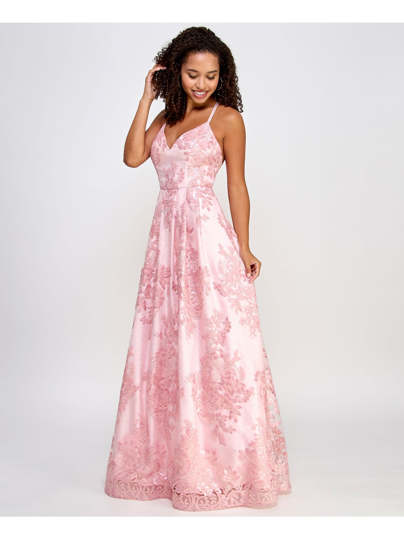 Womens Pink Zippered Pleated Crisscross Back Padded Lined Spaghetti Strap Sweetheart Neckline Full-Length Prom Fit + Flare Dress