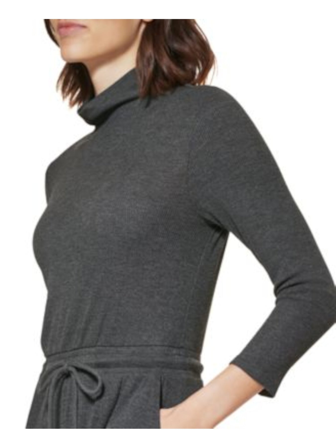 Womens Gray Stretch Ribbed Drawstring Waist Heather 3/4 Sleeve Mock Neck Below The Knee Wear To Work Sweater Dress