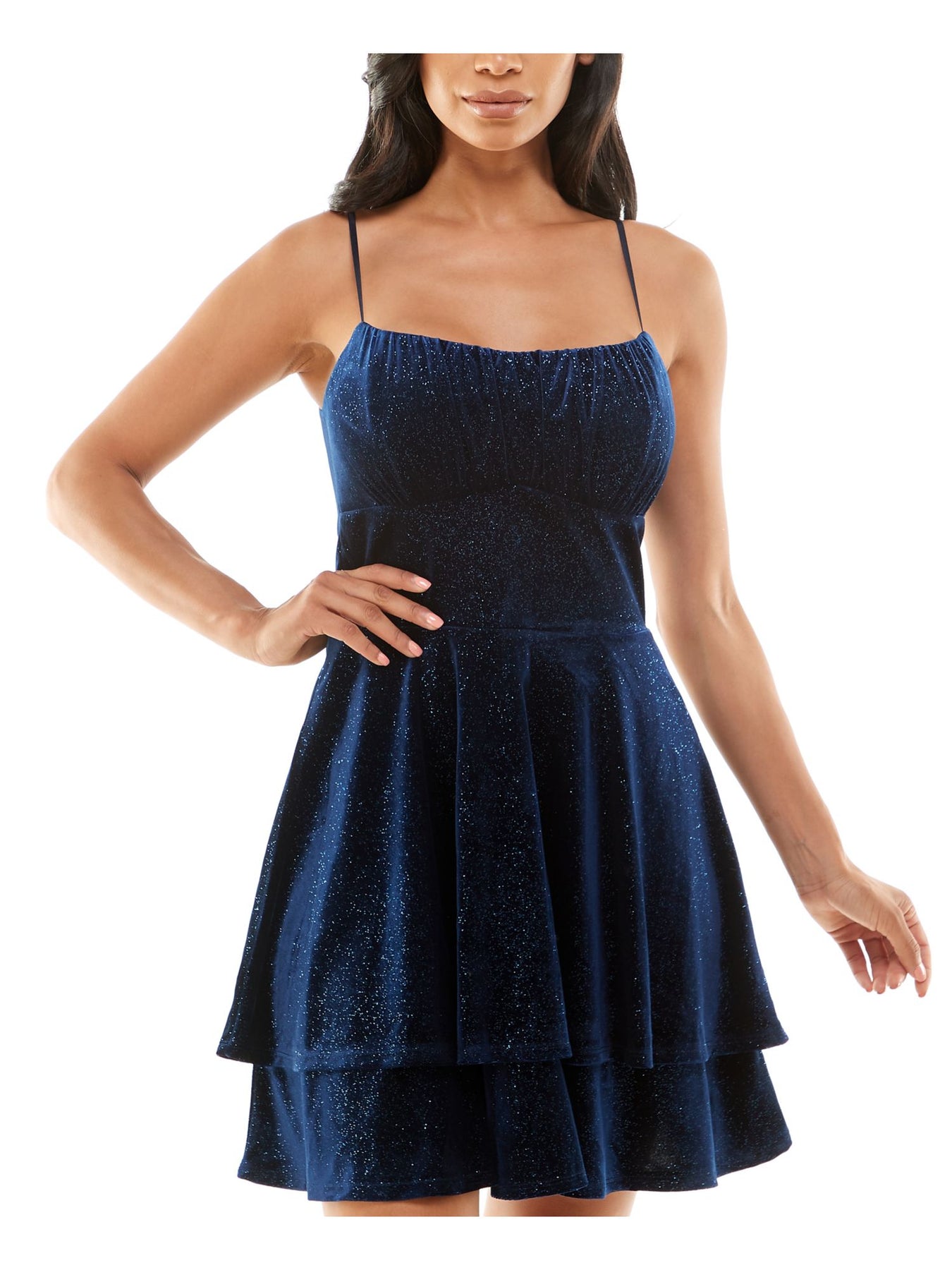 EMERALD SUNDAE Womens Navy Zippered Shirred Double-layer Skirt Spaghetti Strap Square Neck Short Party Fit + Flare Dress