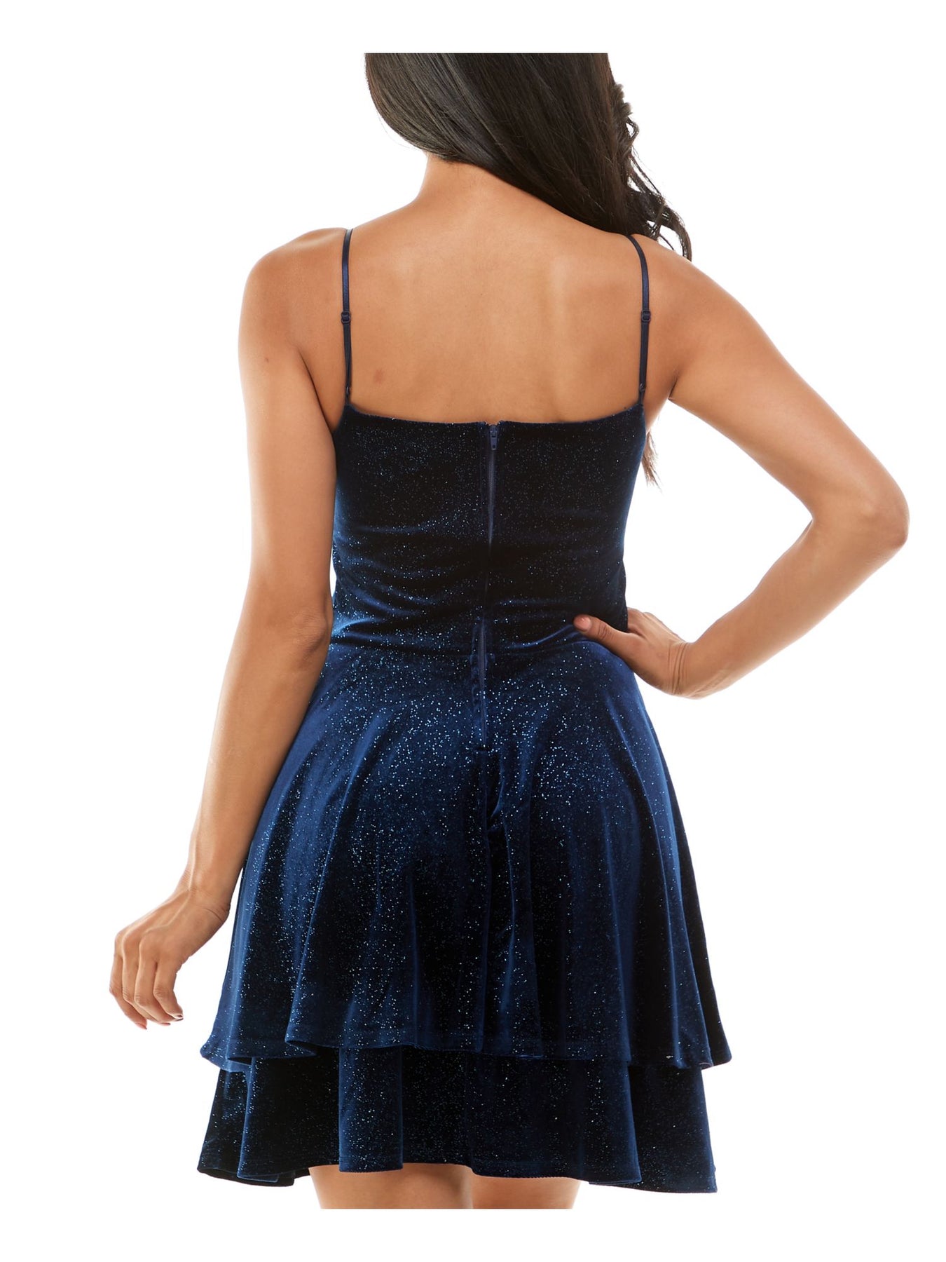 EMERALD SUNDAE Womens Navy Zippered Shirred Double-layer Skirt Spaghetti Strap Square Neck Short Party Fit + Flare Dress Juniors L