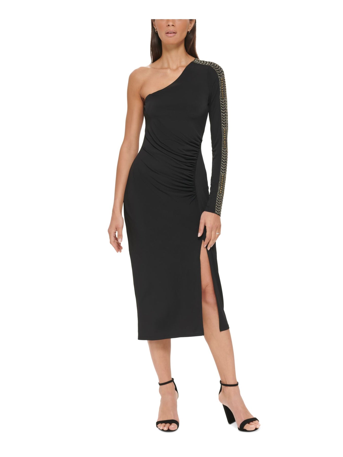 Womens Black Embellished Ruched High Slit Lined Long Sleeve Asymmetrical Neckline Midi Cocktail Sheath Dress