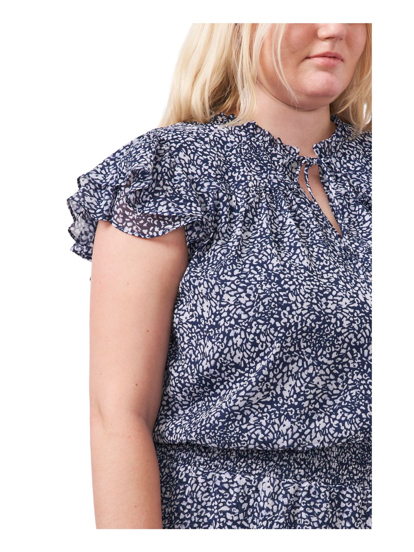Womens Blue Stretch Smocked Ruffled Split Neck Chiffon Lined Printed Flutter Sleeve Knee Length Evening Fit + Flare Dress