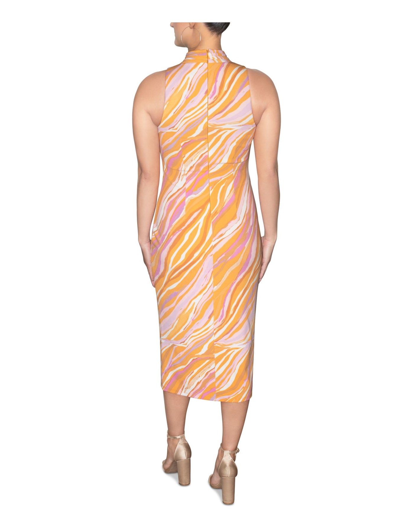 Womens Gold Zippered Cut Out Pleated Crossover Printed Sleeveless Mock Neck Midi Evening Sheath Dress