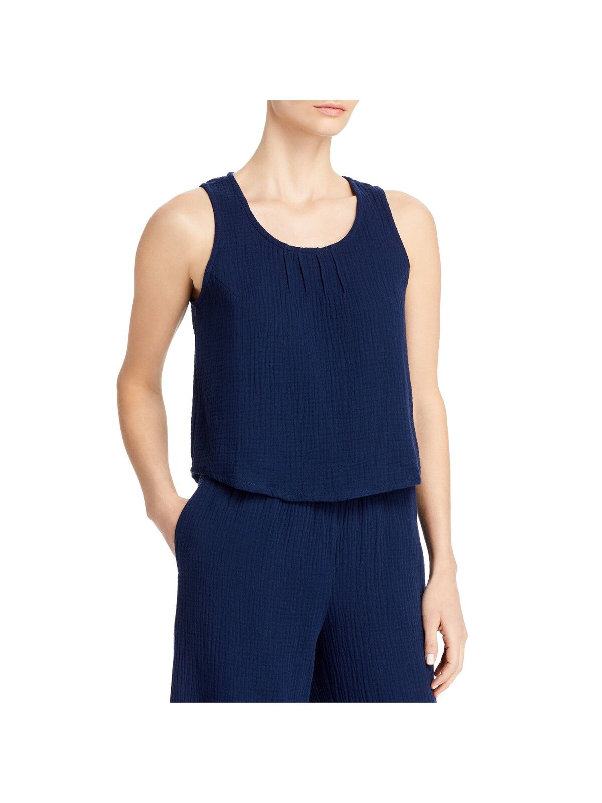 THREE DOTS Womens Top Tank Navy Textured Sleeveless Scoop Neck Solid Double Gauze Pintuck Front M