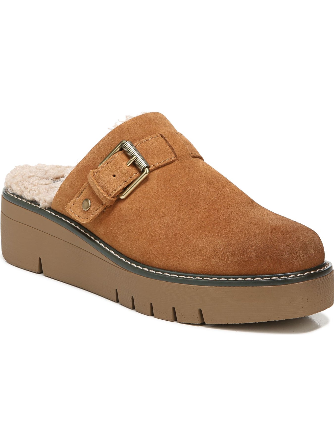 Womens Orange Buckle Accent Faux Shearling 1" Platform Comfort Goring Wayde Round Toe Wedge Slip On Mules M