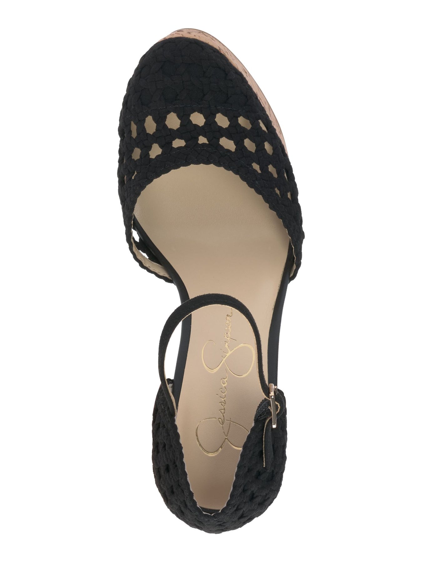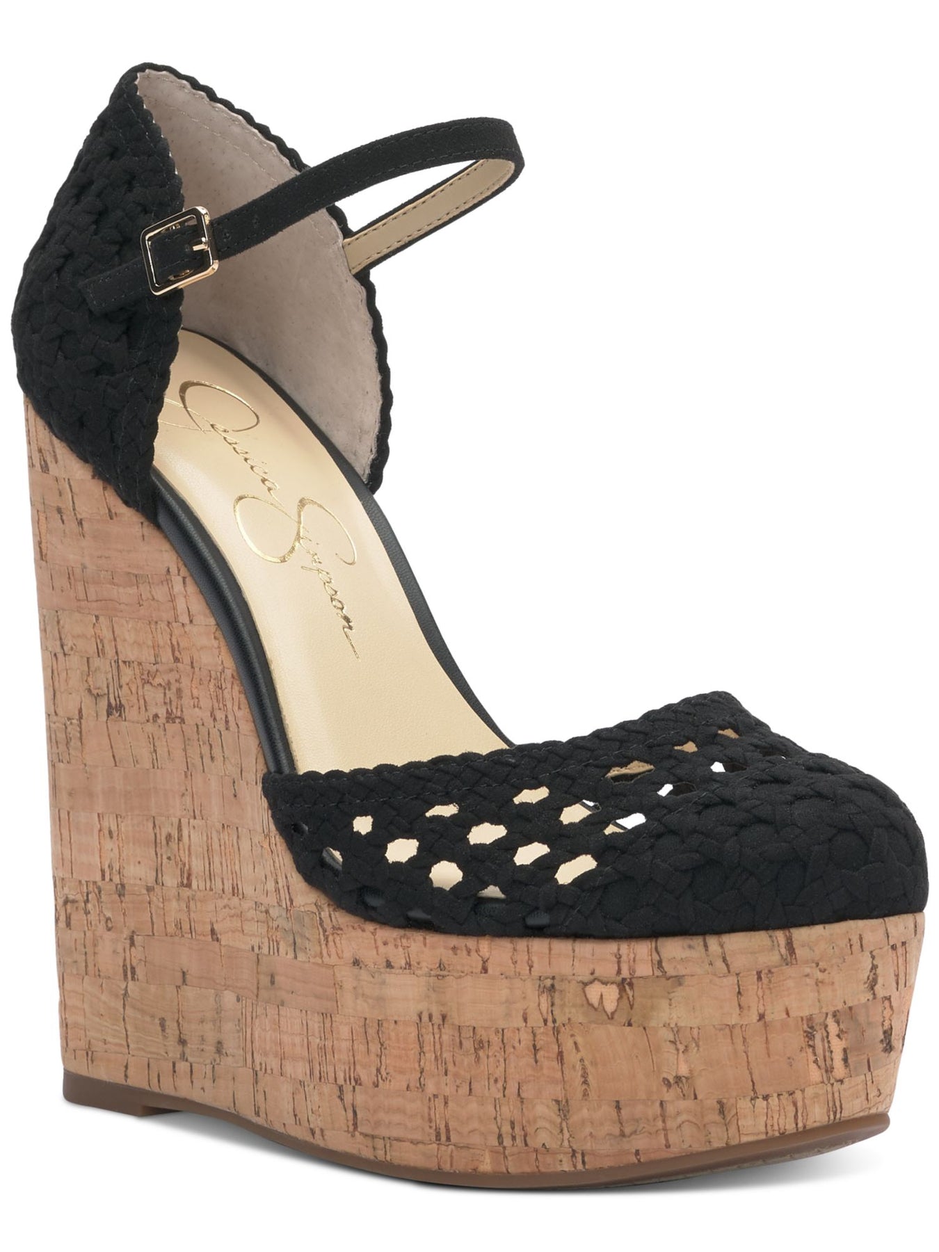 Womens Black 2 Cork-Like Wedge Woven Cut Out Marshela Round Toe Wedge Buckle Dress Heeled M