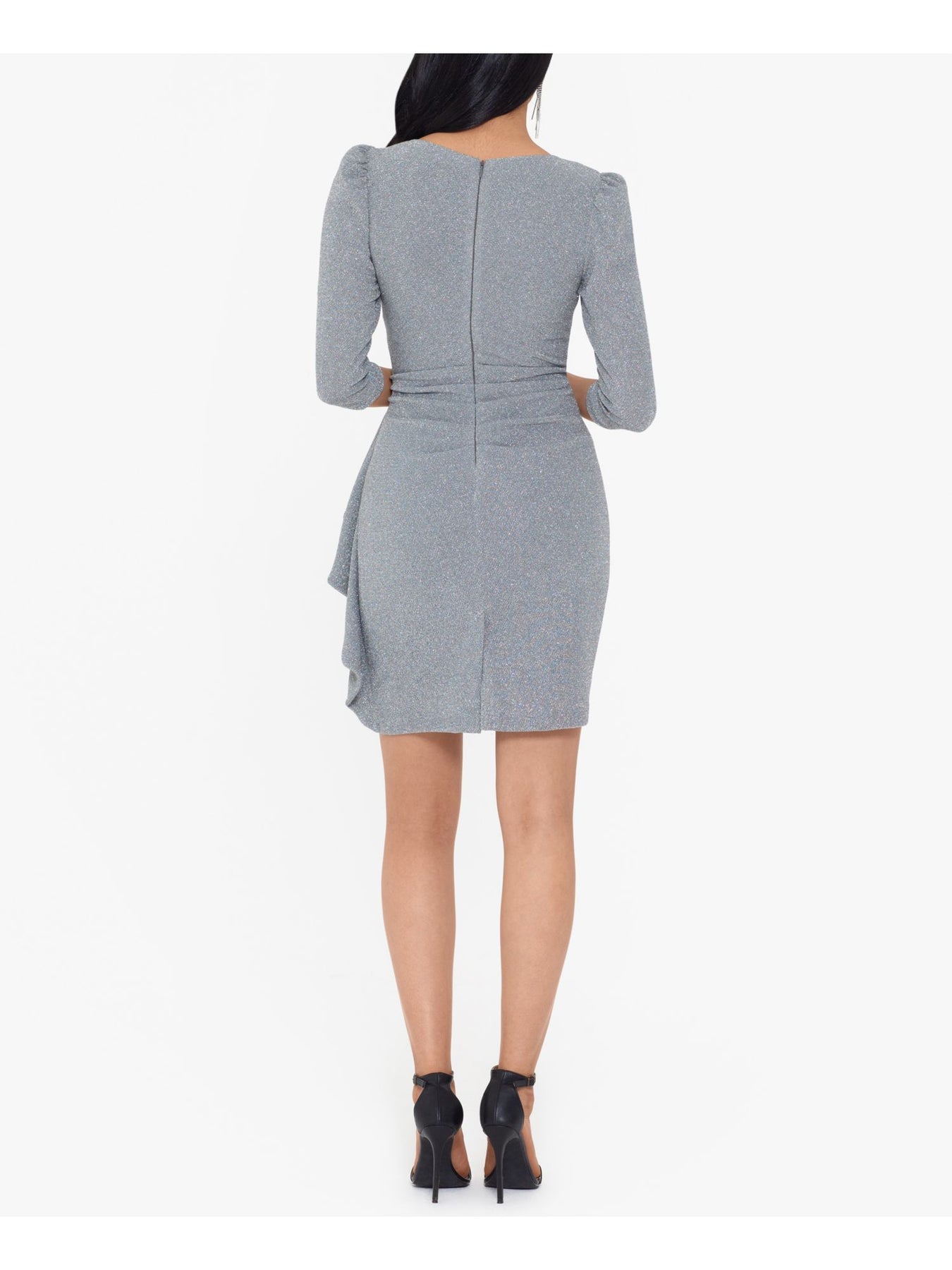 BETSY & ADAM Womens Silver Glitter Ruffled 3/4 Sleeve Surplice Neckline Short Party Sheath Dress 4