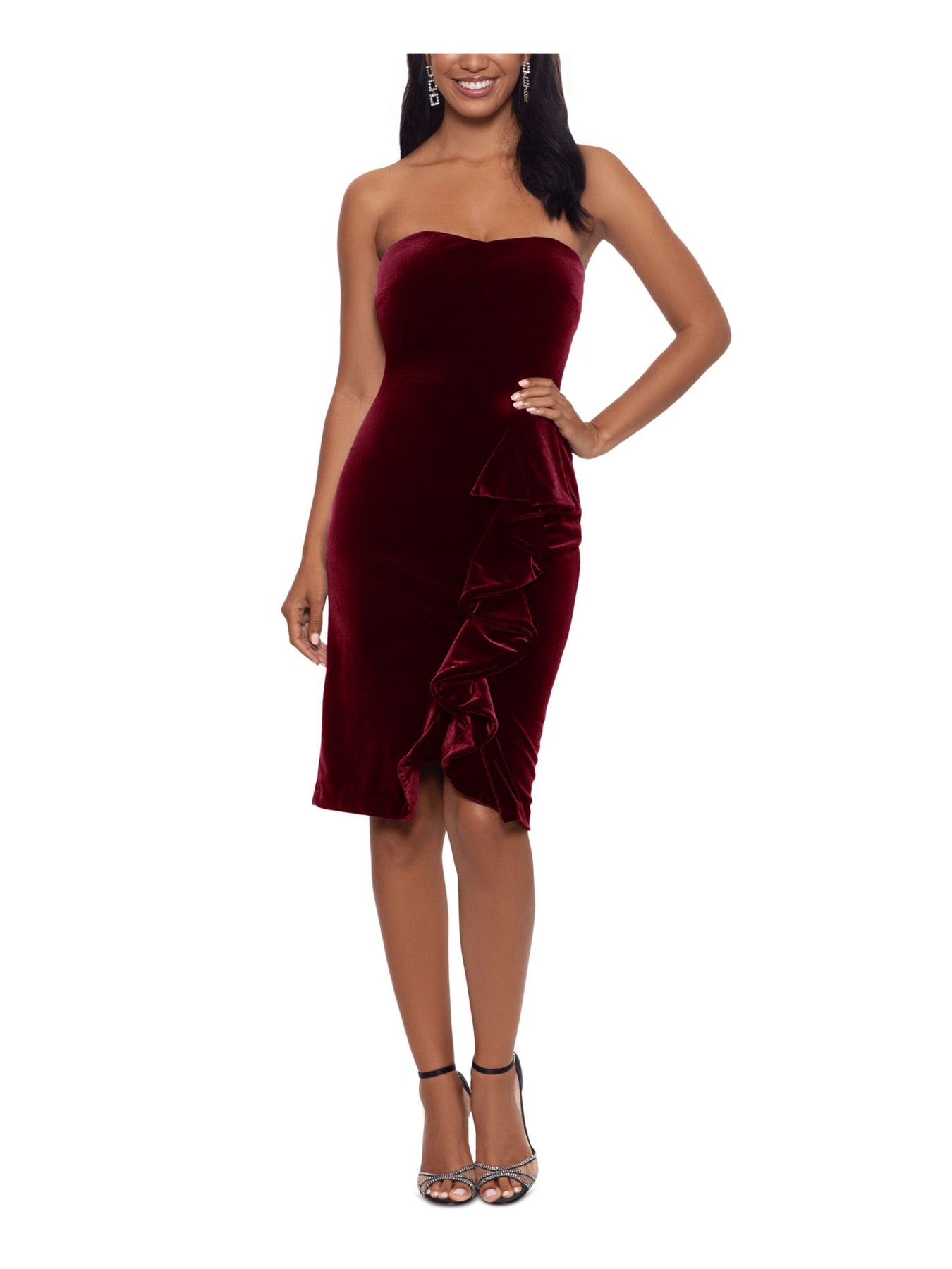BETSY & ADAM Womens Burgundy Stretch Zippered Ruffled Slit  Lined Sleeveless Sweetheart Neckline Above The Knee Evening Sheath Dress 4