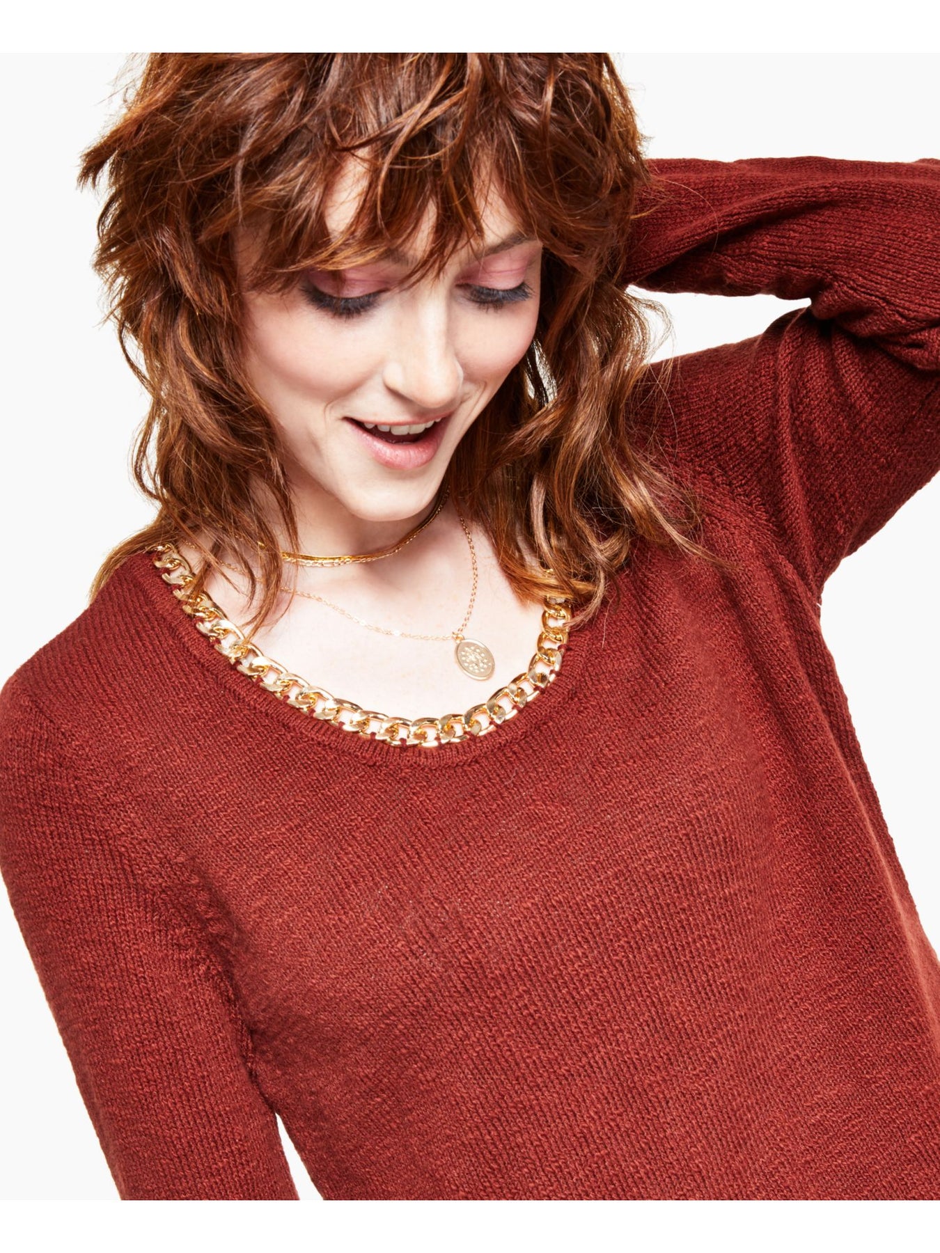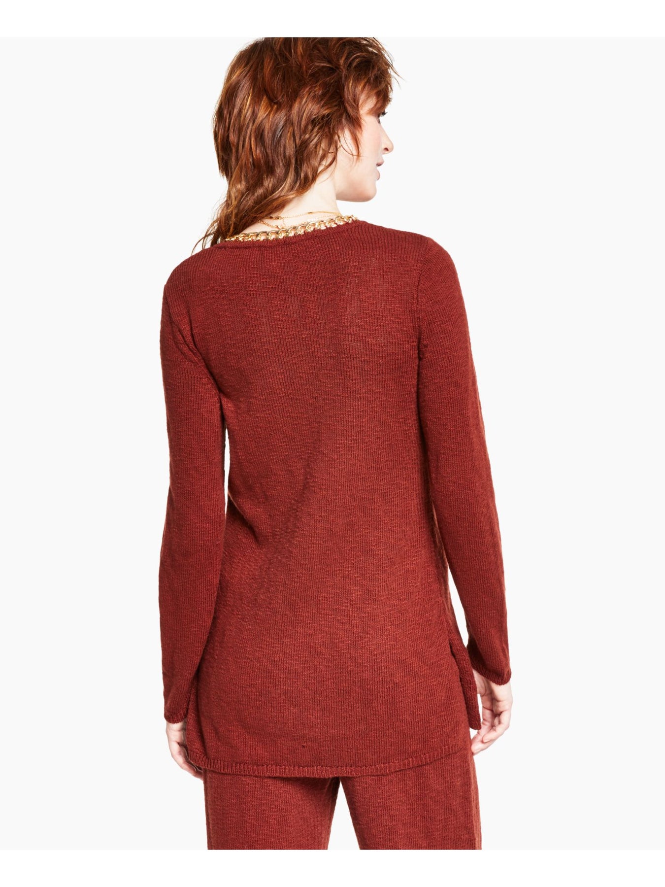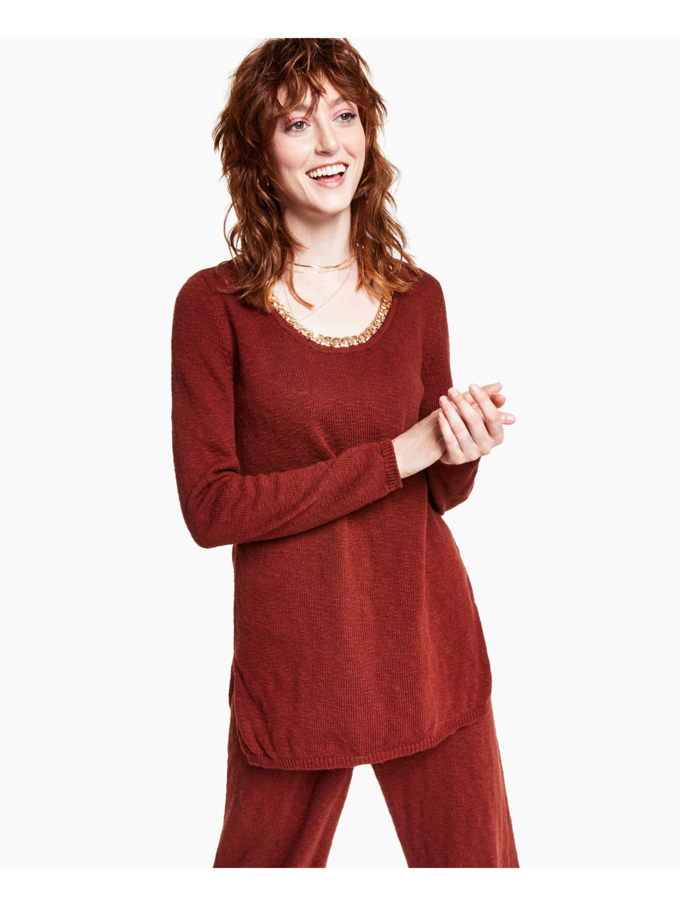 INC Womens Brown Textured Chain Embellished Ribbed Trim Long Sleeve Scoop Neck Wear To Work Tunic Sweater M