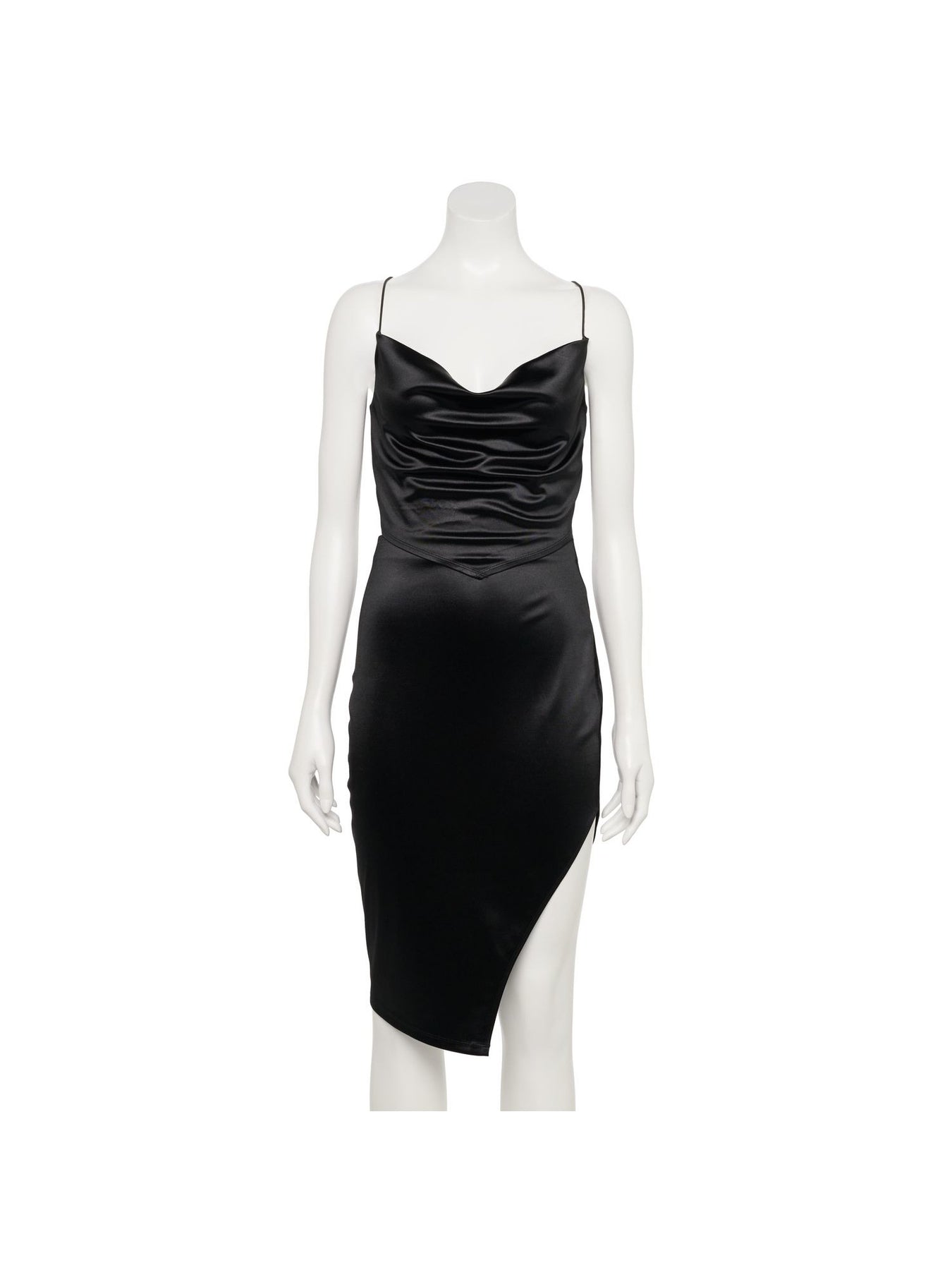 Womens Black Stretch Smocked Satin Asymmetrical Hem Spaghetti Strap Scoop Neck Below The Knee Cocktail Body Con Dress