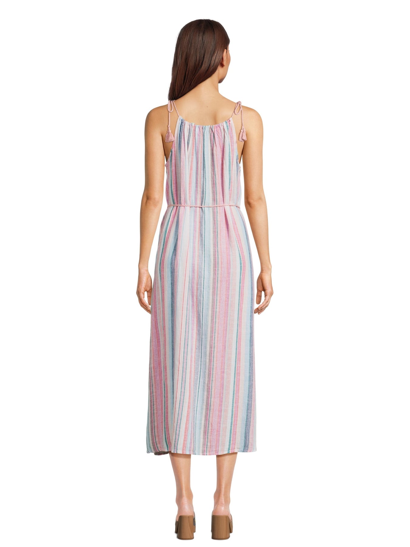 Womens Coral Unlined Tie Shoulders And Belt Striped Sleeveless Scoop Neck Midi Shift Dress