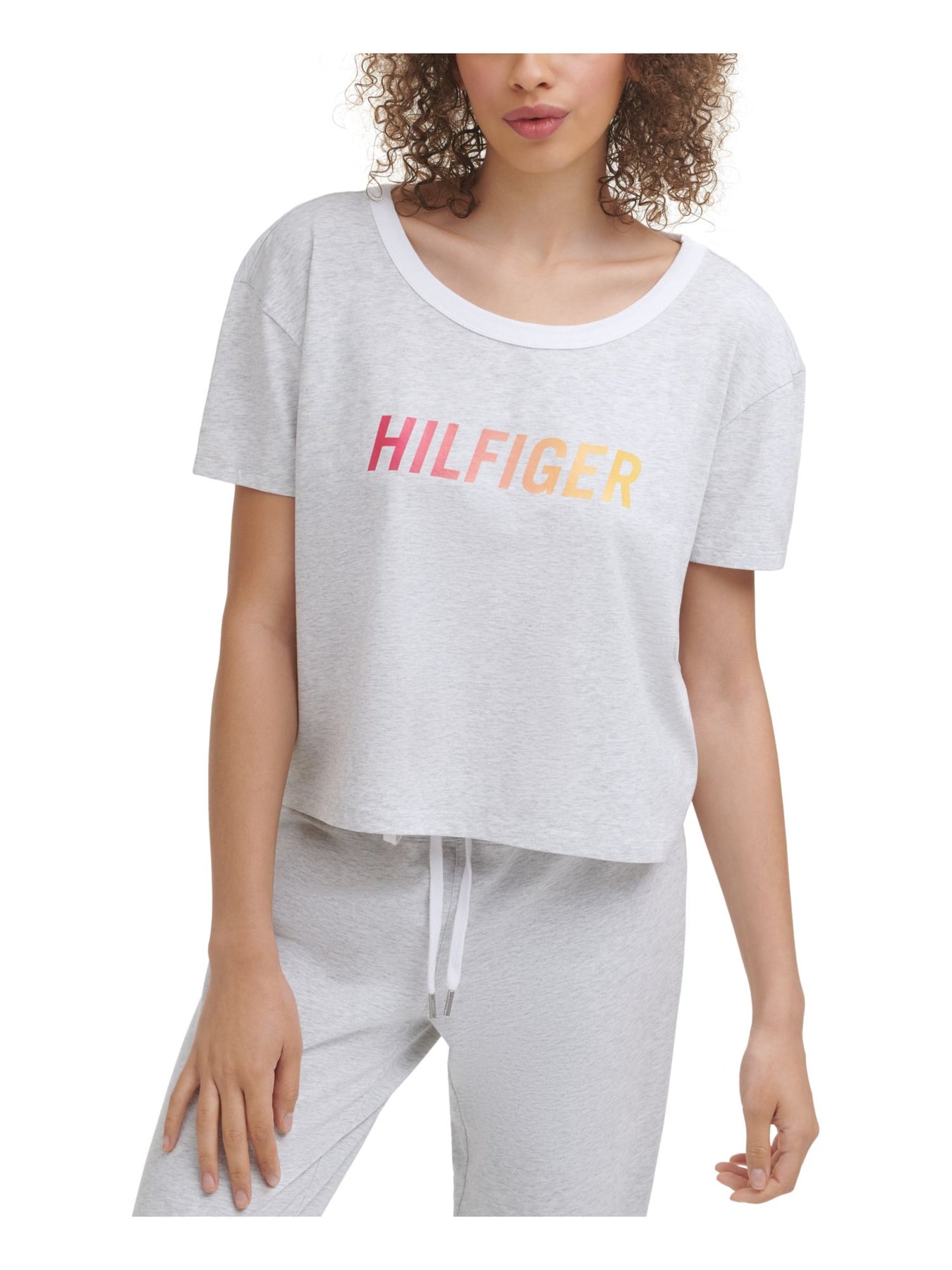 TOMMY HILFIGER Womens T-Shirt Gray Cut Out Short Length Short Sleeve Scoop Neck Logo Graphic Ribbed Collar Breathable XS