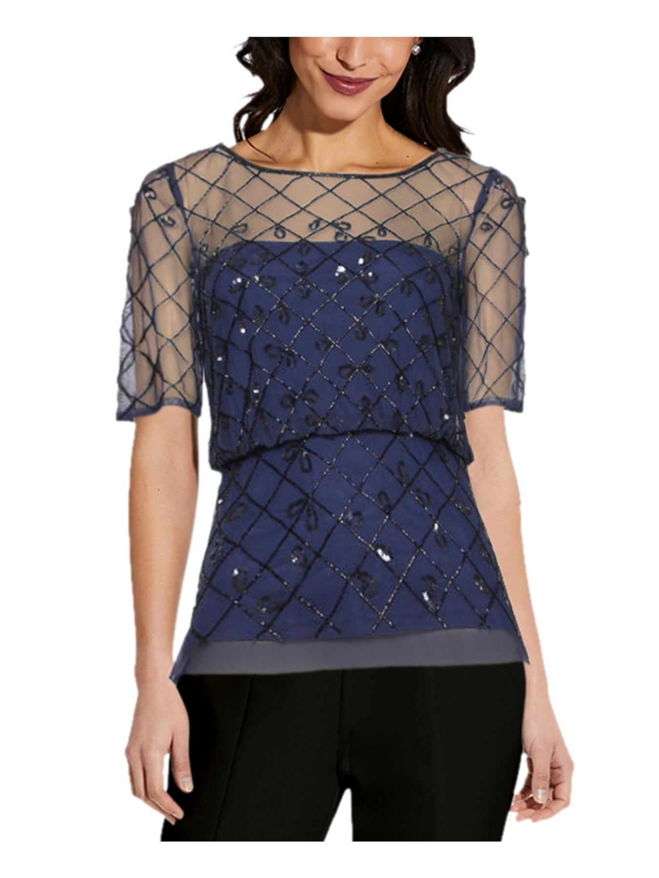 ADRIANNA PAPELL Womens Navy Beaded Sheer Zippered Short Sleeve Crew Neck Evening Top 2