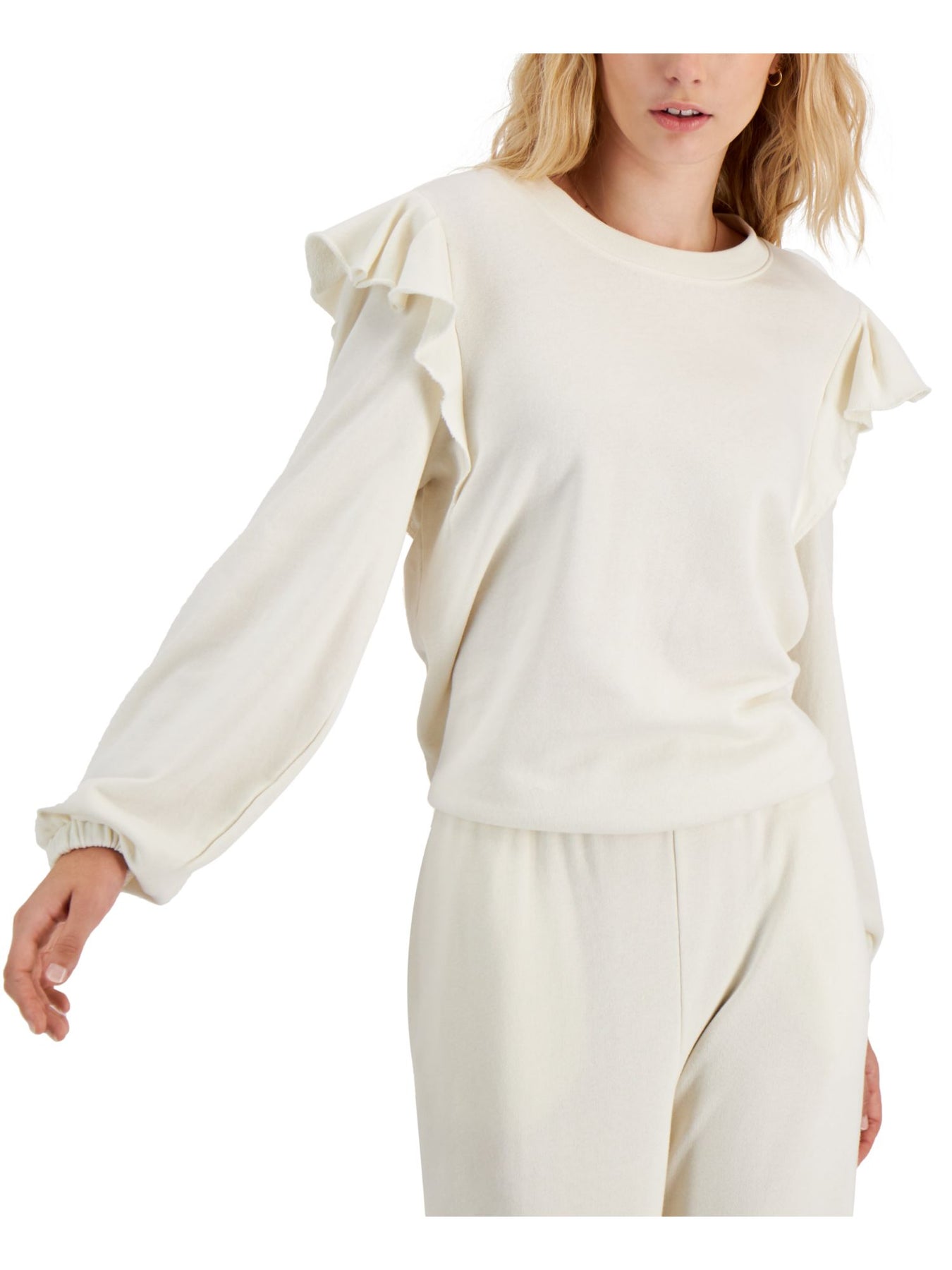 INC Womens Ivory Ruffled Long Sleeve Crew Neck Sweater L