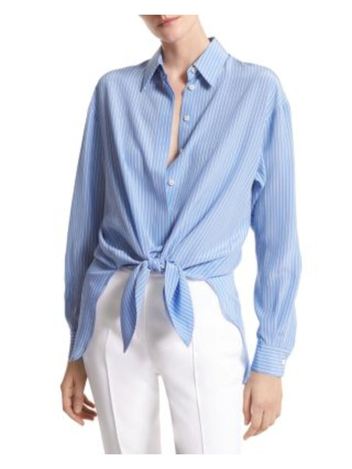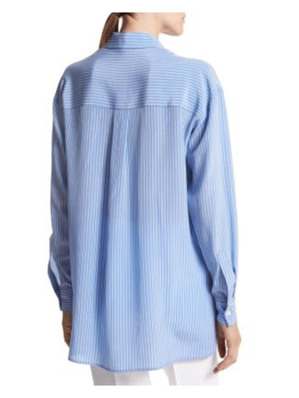 MICHAEL KORS COLLECTION Womens Blue Tie Hi-lo Striped Cuffed Sleeve Collared Blouse 12