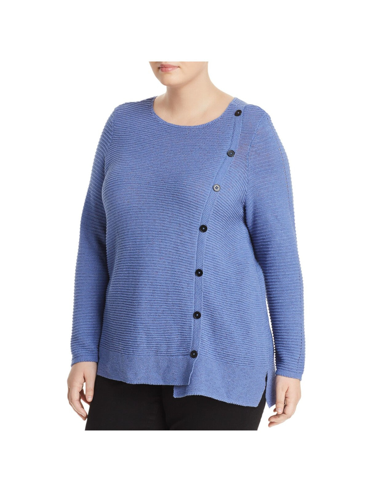 NIC+ZOE Womens Blue Knit Slitted Ribbed Asymmetrical Faux-wrap Front Long Sleeve Collarless Faux Wrap Sweater Plus 1X