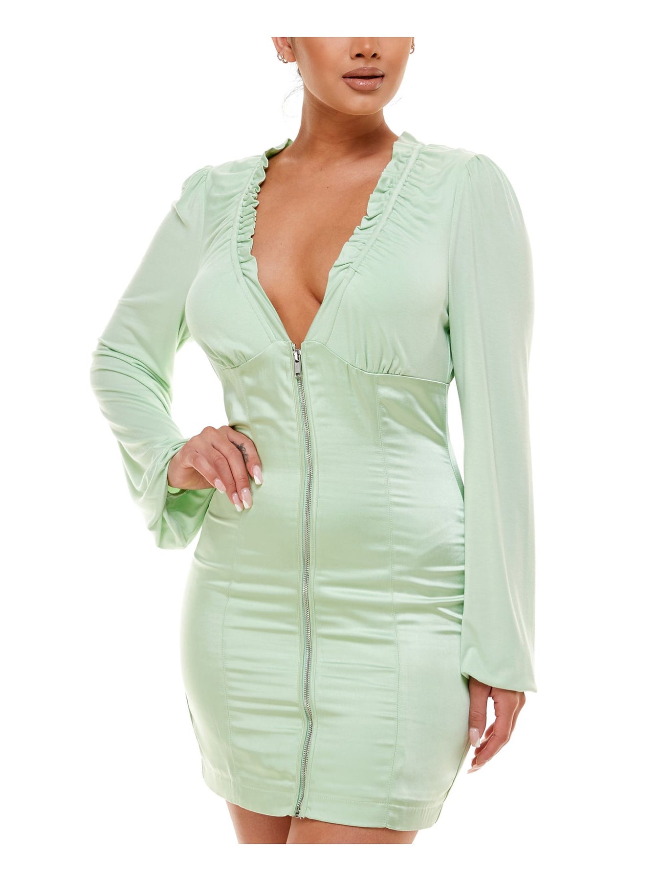 BEBE Womens Green Stretch Zippered Ruffled Empire Waist Long Sleeve V Neck Mini Cocktail Body Con Dress  L
