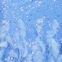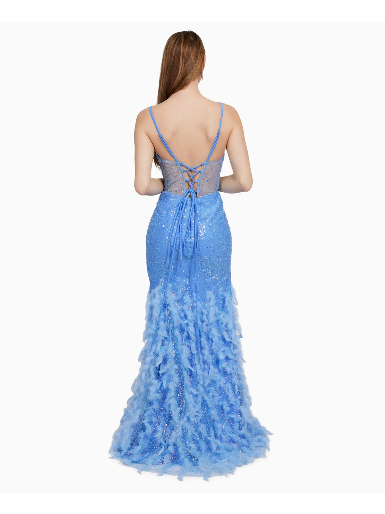 Womens Light Blue Zippered Slitted Sheer Bodice Boning Feathered Spaghetti Strap V Neck Full-Length Prom Gown Dress