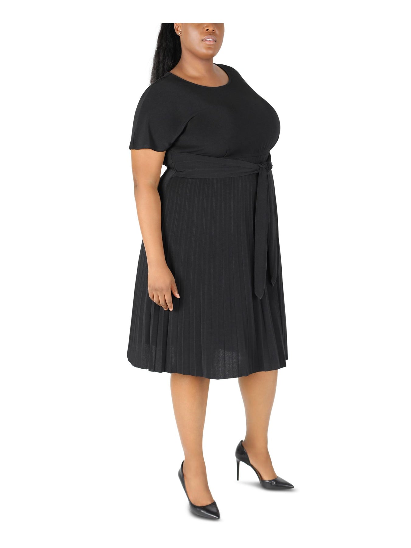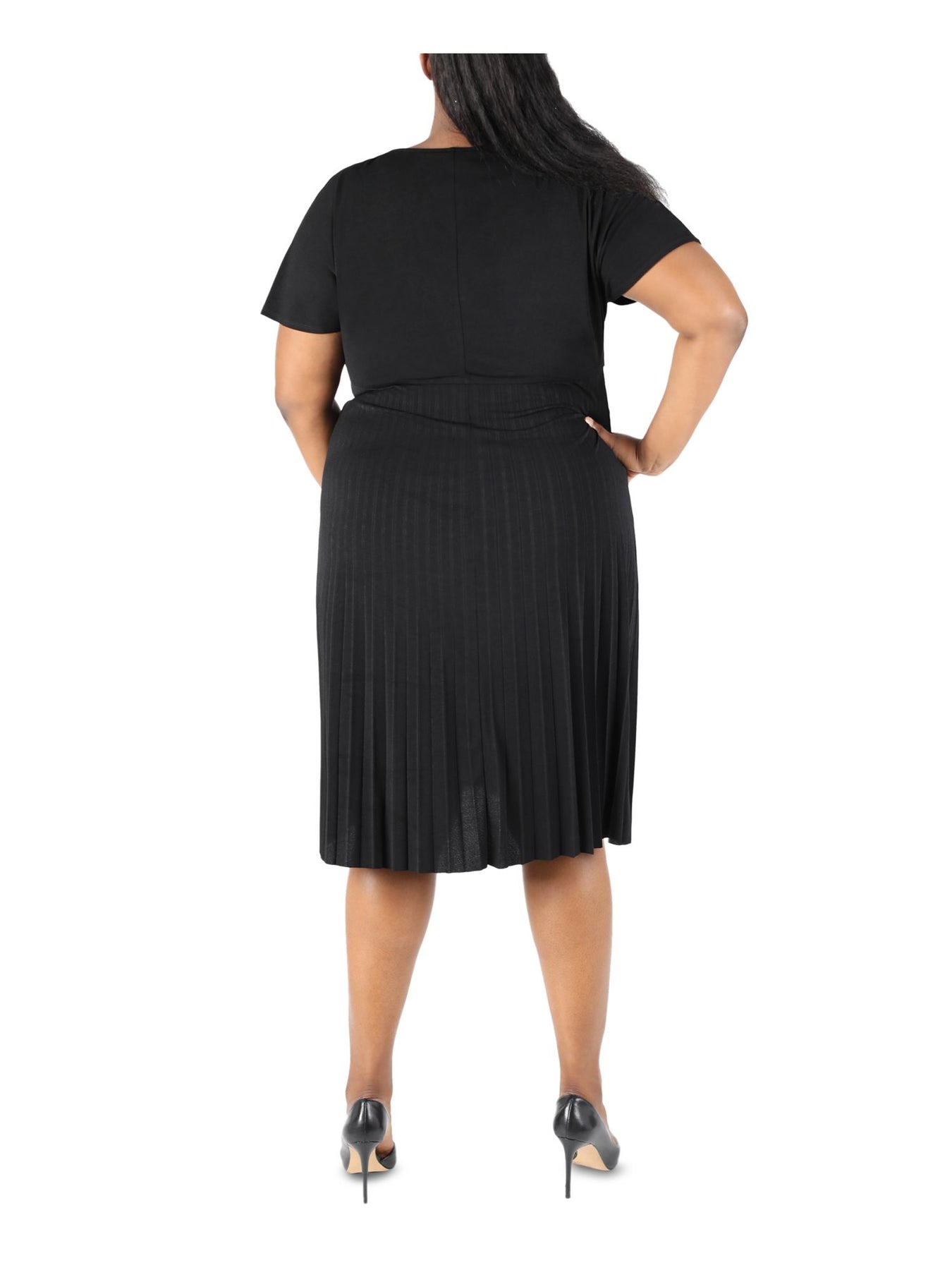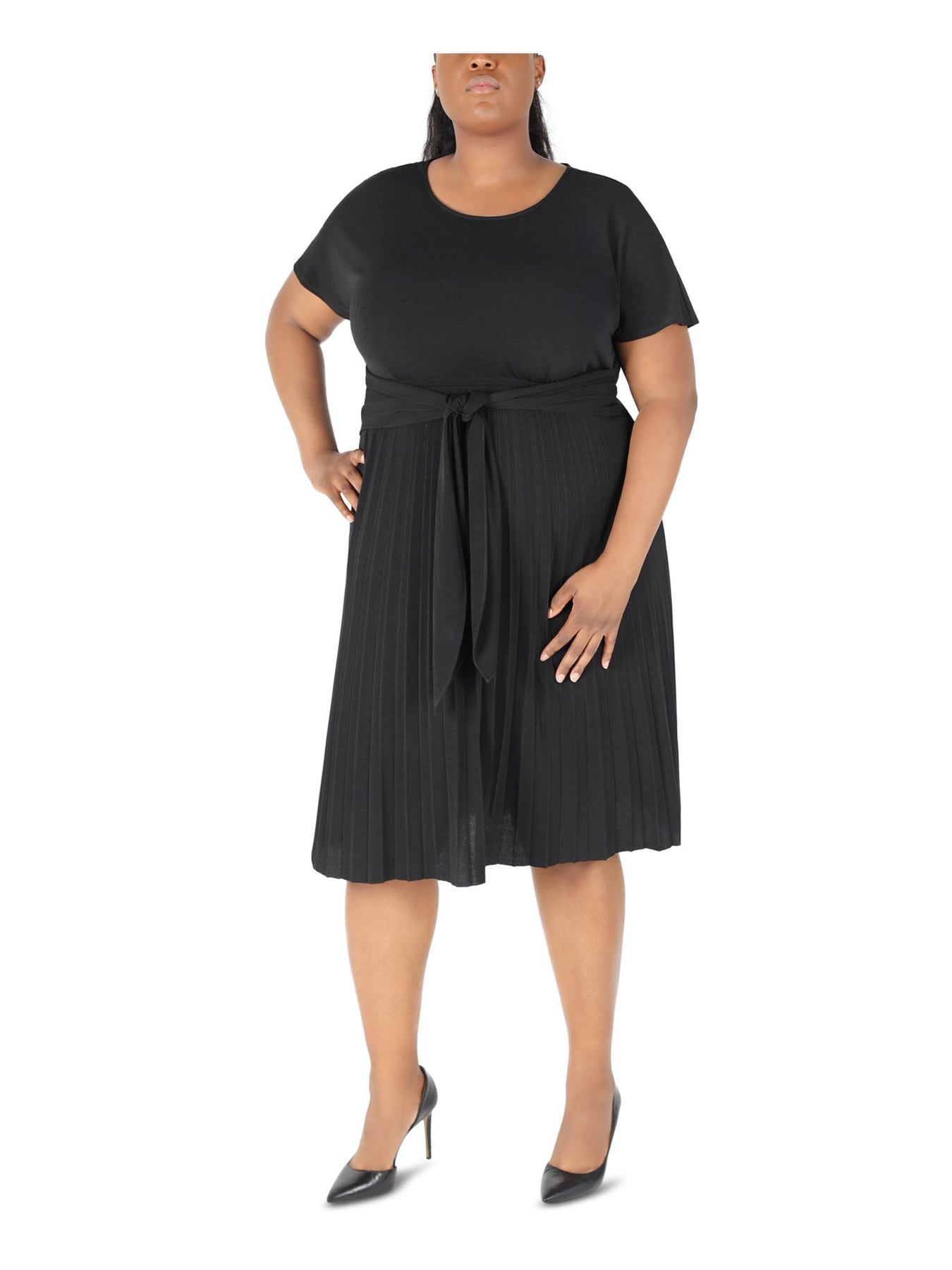 ROBBIE BEE Womens Black Jersey Pleated Tie Pullover Style Unlined Short Sleeve Round Neck Below The Knee Fit + Flare Dress Plus 2X