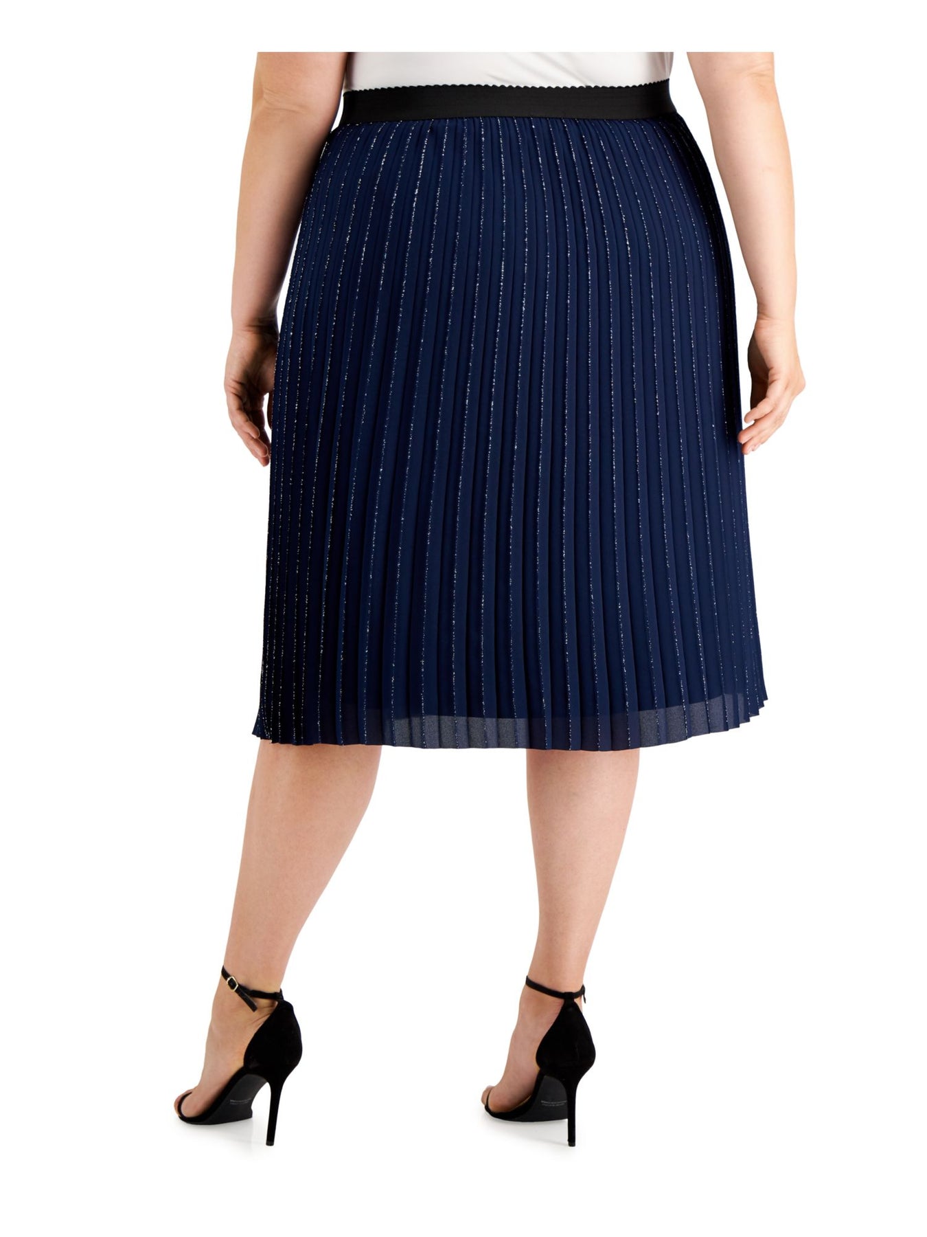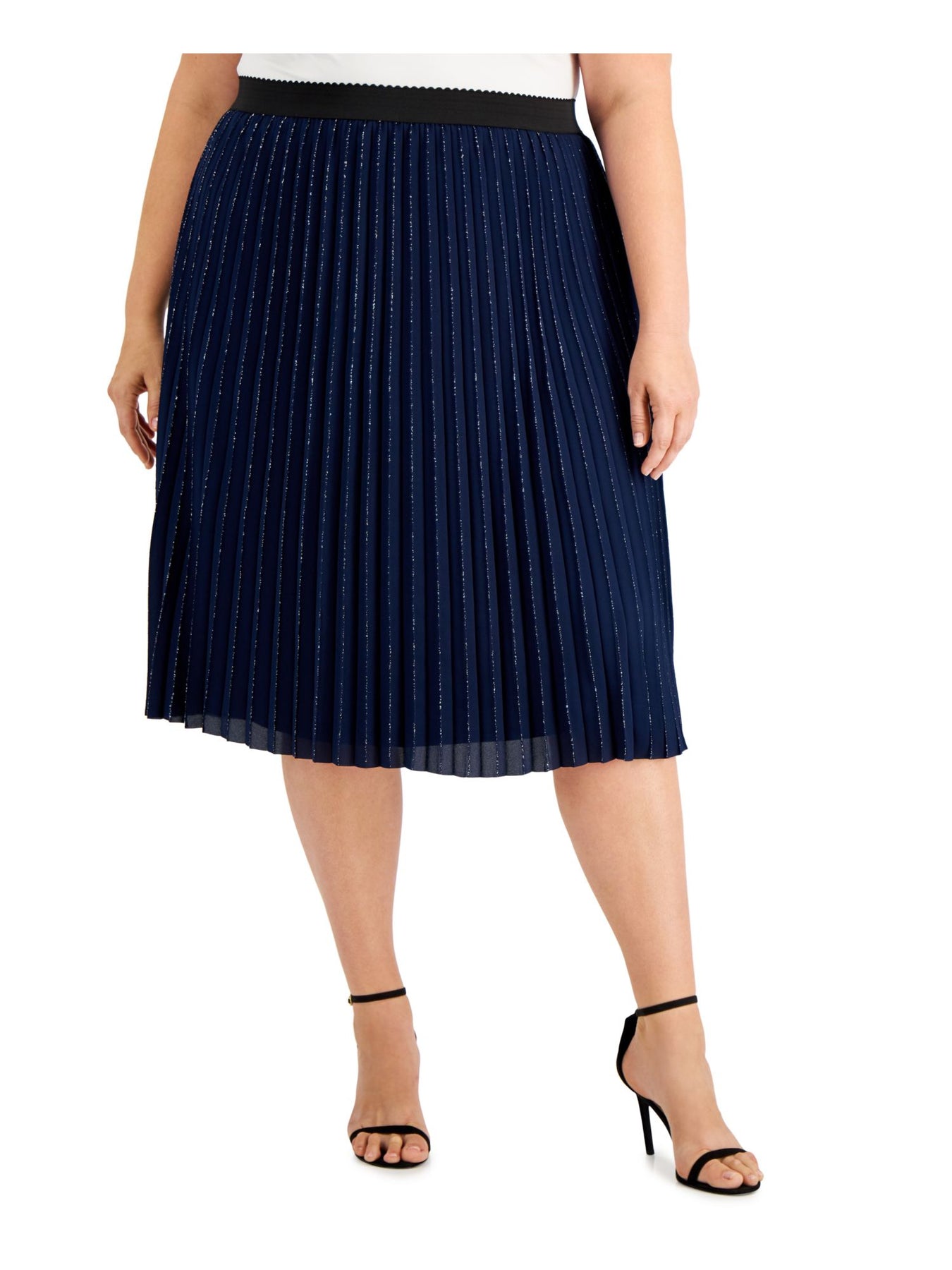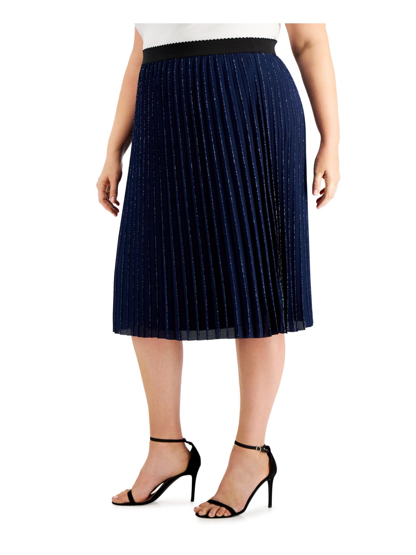 ADRIANNA PAPELL Womens Navy Metallic Pull On Styling Tea-Length Cocktail Pleated Skirt Plus 18W