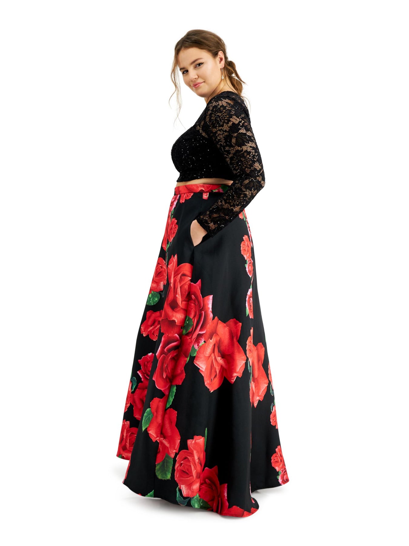 B DARLIN Womens Crop Top Black Sequined Lace Long Sleeve Crew Neck Party Floral Plus 16W