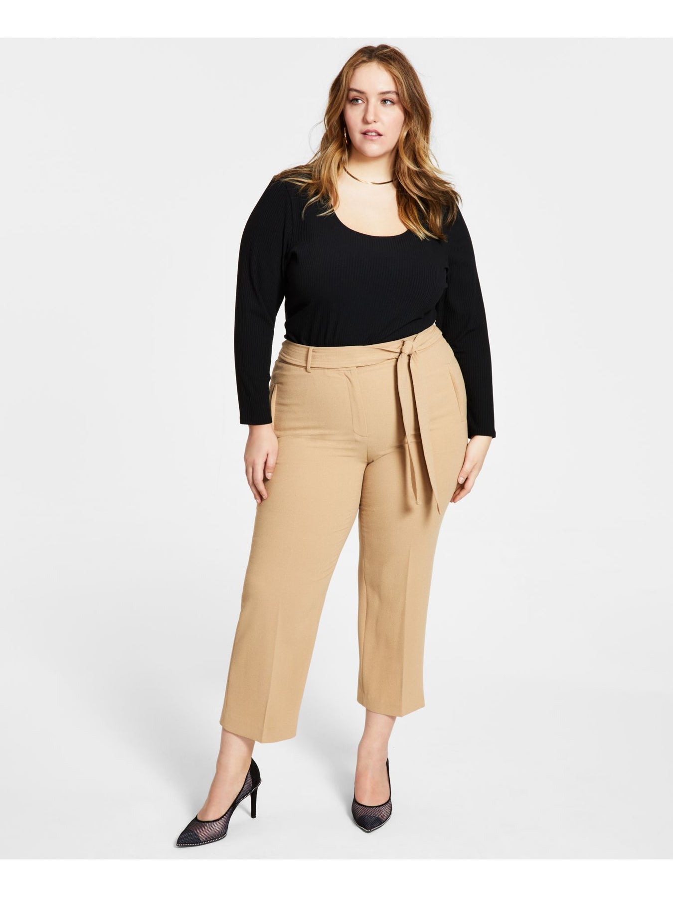 Womens Belted Zippered Hook And Bar Closure Self Tie Wear To Work High Waist Pants