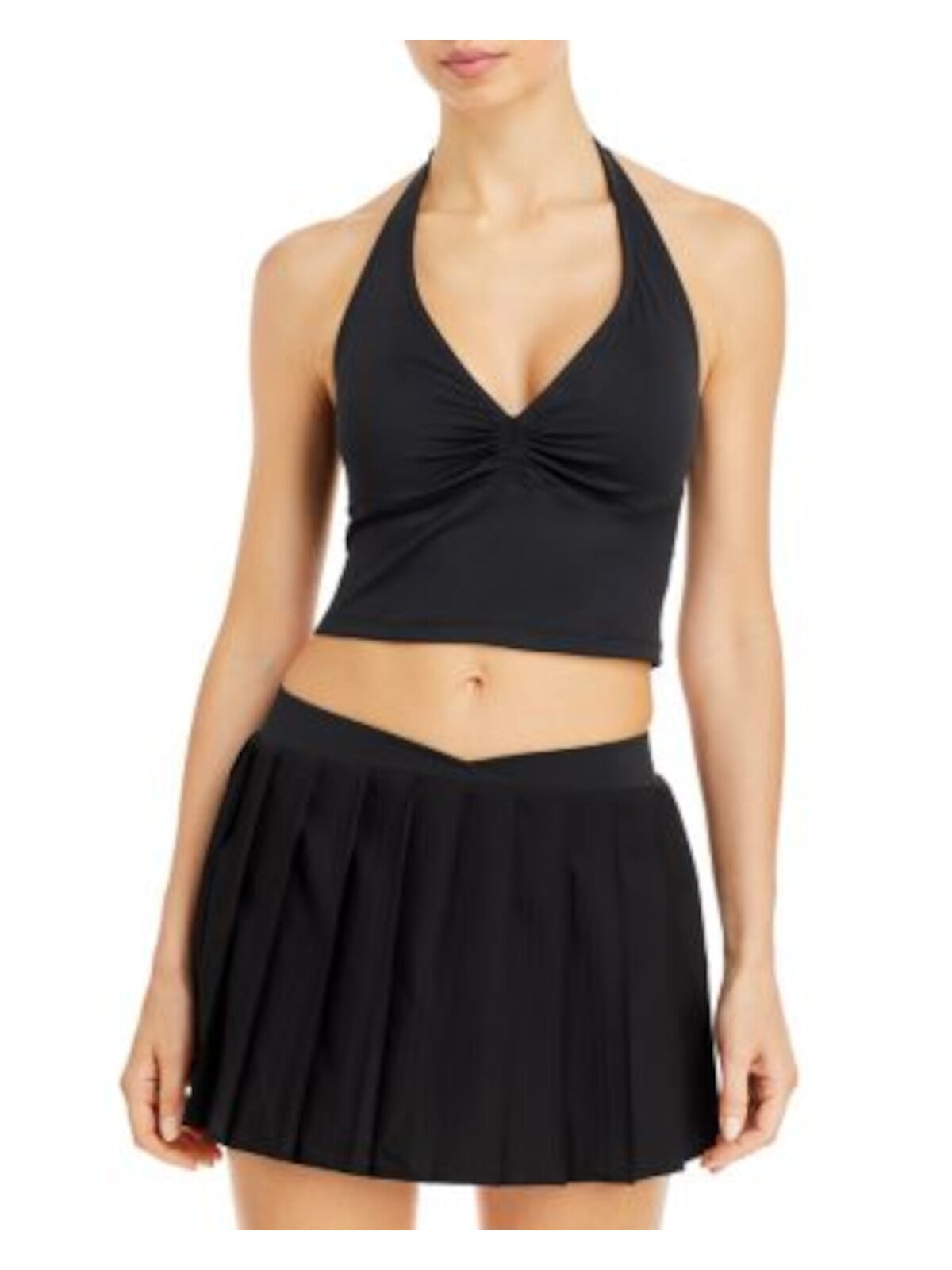 FRANKIES BIKINIS Womens Crop Top Black Ruched Sleeveless Halter Solid Removable Padded Cups Juniors XS