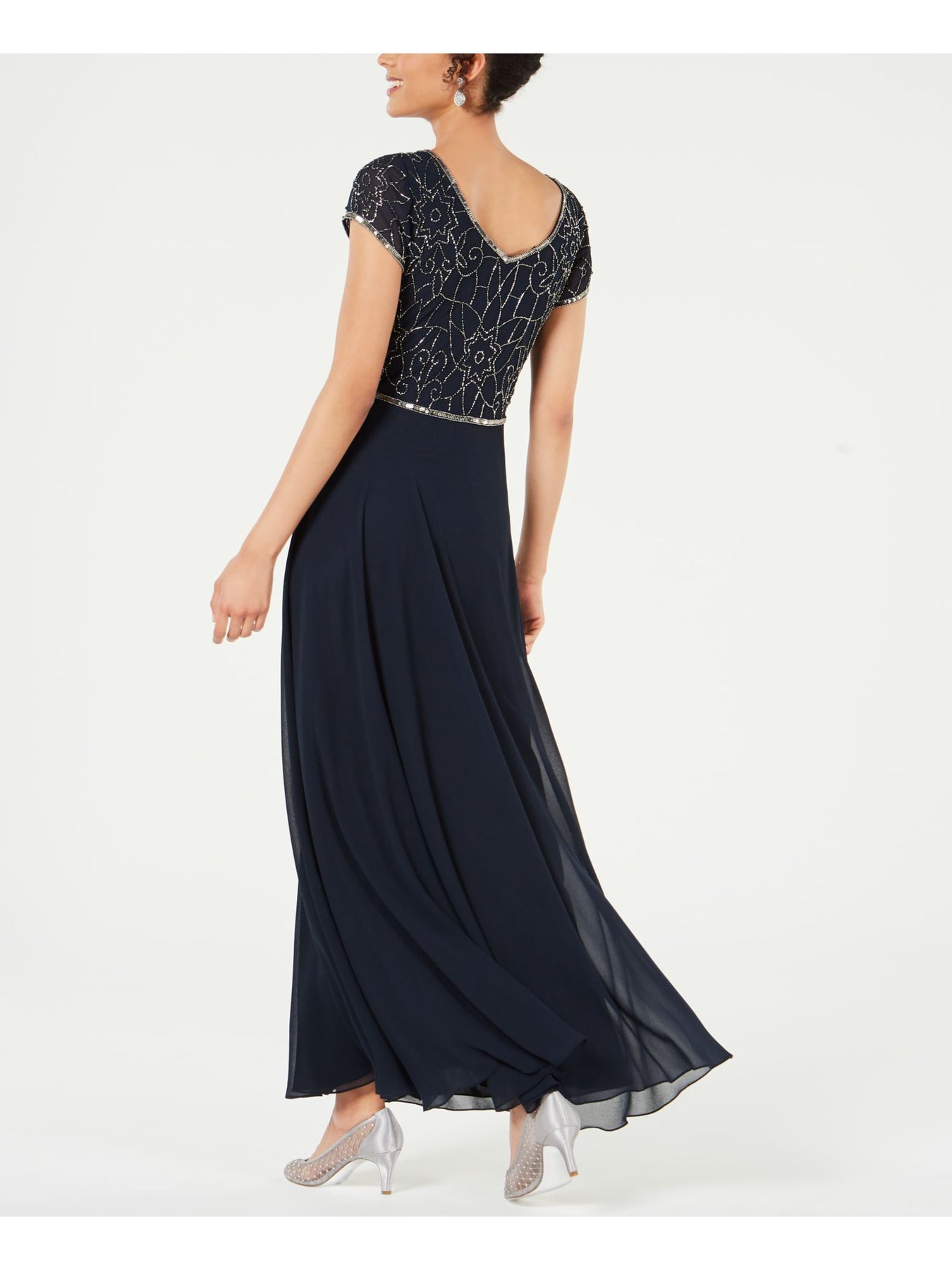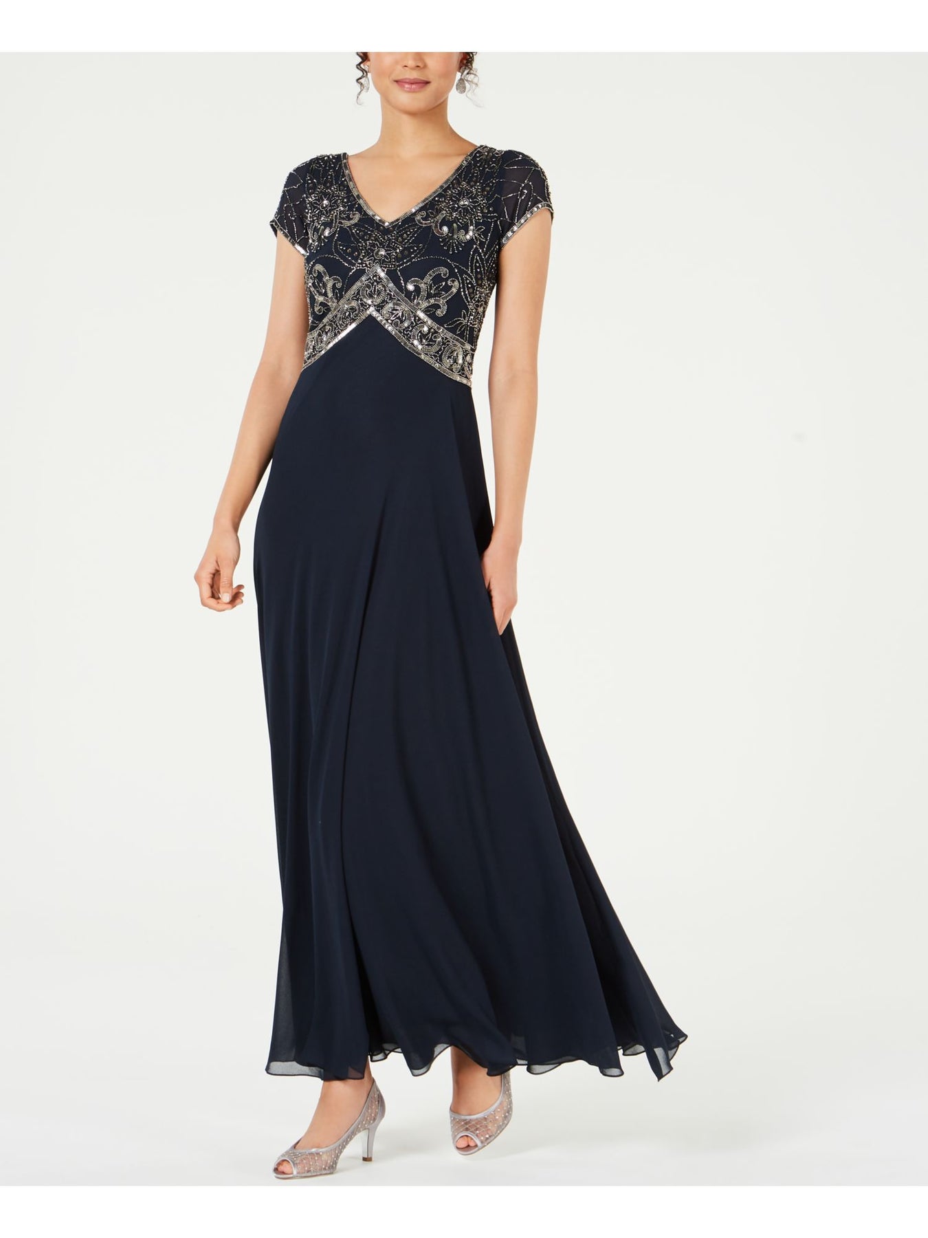 JKARA Womens Navy Beaded Cap Sleeve V Neck Maxi Evening Sheath Dress 10