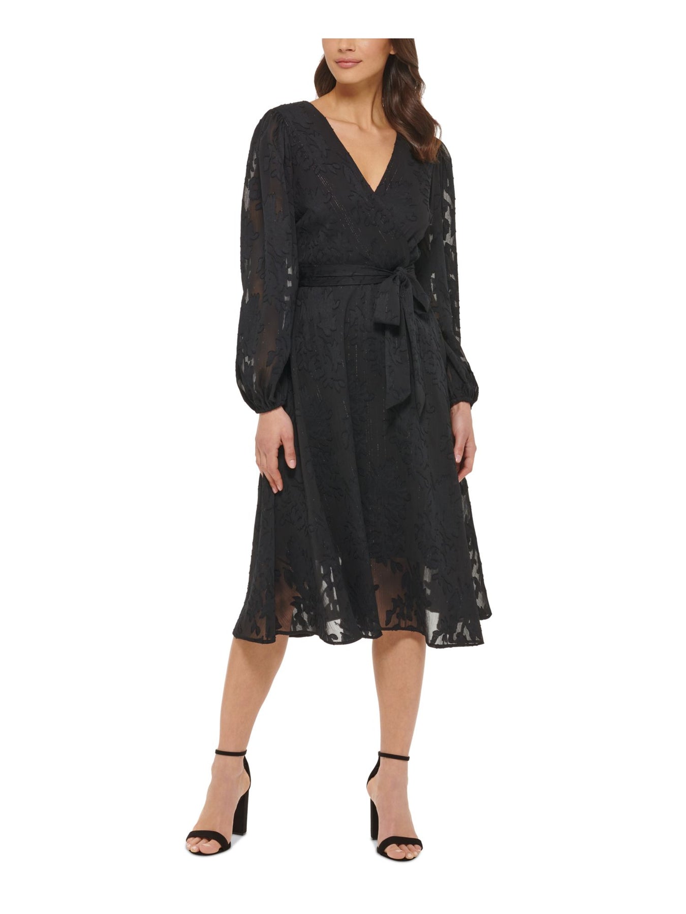 Womens Black Zippered Tie Lined Balloon Sleeve Surplice Neckline Below The Knee Fit + Flare Dress