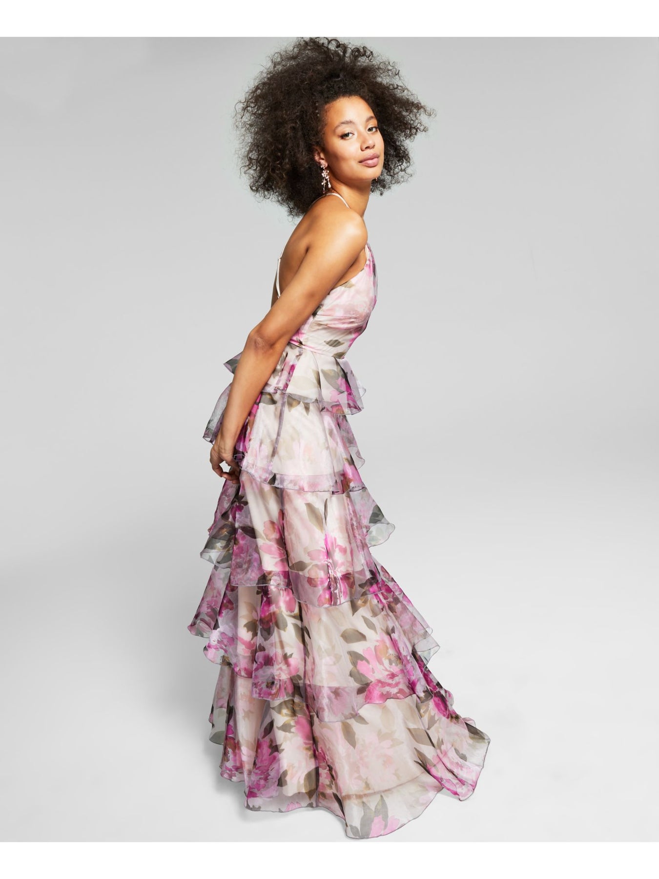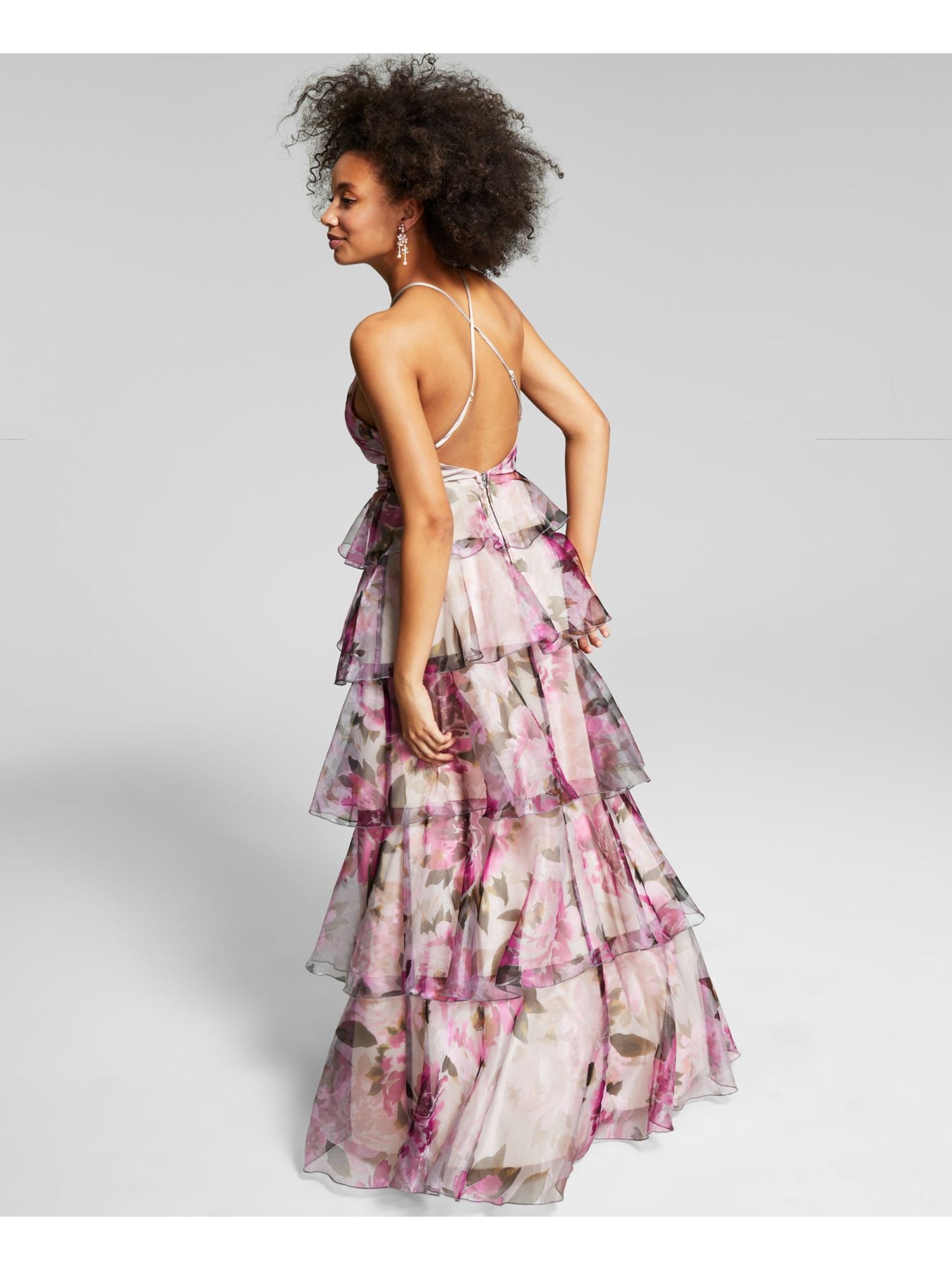 SPEECHLESS Womens Gray Zippered Sheer Tiered Crisscross Back Lined Floral Spaghetti Strap Halter Full-Length Party Empire Waist Dress Juniors 1