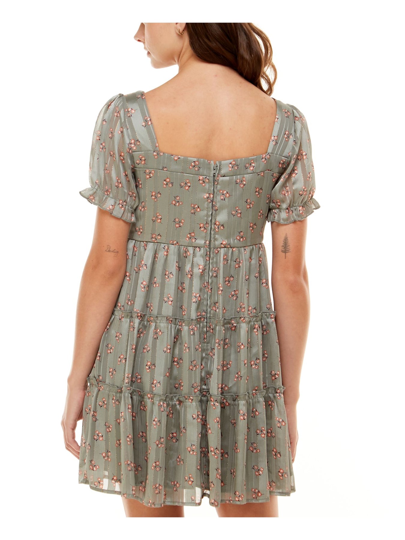 TRIXXI Womens Green Pleated Metallic Zippered Lined Tiered Floral Pouf Sleeve Square Neck Mini Party Baby Doll Dress M